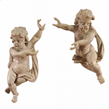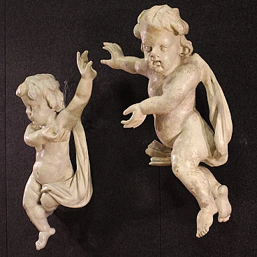 Pair of 18th century Italian sculptures. Wooden works of great size and impact, pleasingly carved, depicting putti. Painted ivory-coloured sculptures (non-original painting, revived in the 20th century) of beautiful decoration. Works in mirrored positions, left and right, ideal for placement on the sides of a bed or a mirror in the living room. Sculptures complete with metal hooks attached to the back (see photo). Show some signs of time and old restorations, overall in good state of preservation.