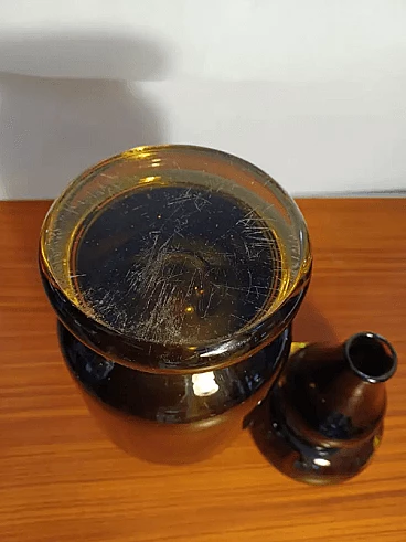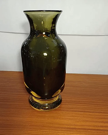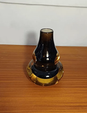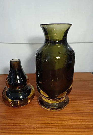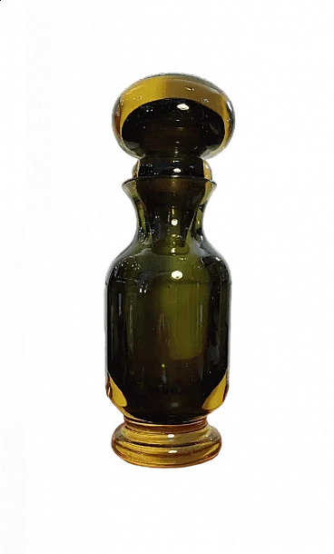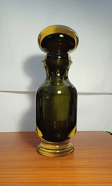 Elegant and refined vase with submerged glass stopper mod. 13752 Mario Pinzoni Seguso Artistic glass. Beautiful topaz yellow and olive green glass. The bottle/vase is made up of 2 pieces, the cap becomes a small single-flower vase. Diameter 36 cm.