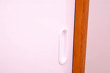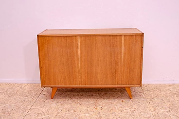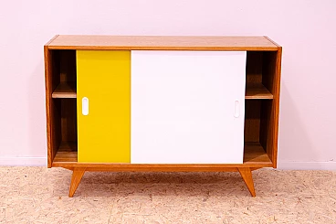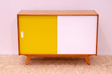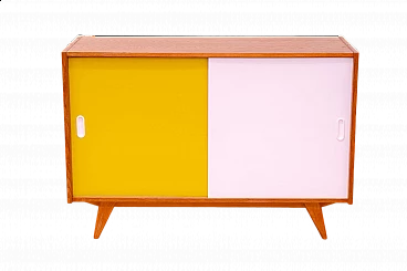 U-452 sideboard with sliding doors by Jiří Jiroutek for Interiér Praha, 1960s. Made of beech, veneer, plywood and laminate. Excellent condition, fully restored. Part of the famous Universal series (U-450) designed in 1958 for the Czechoslovak national company Interiér Praha by Czech designer Jiří Jiroutek. The success of the Czech pavilion at Expo 58 in Brussels was followed by the rise of the modernist style (called "Brussels style" in Czechoslovakia). One of the most important representatives of the Brussels style are the U-450 series cabinets and drawer units with their typical pastel colors and sloping legs. In Czechoslovakia of the 1960s and 1970s they could be found in almost every modern home. The cabinets were unique not only in design but also in their technological innovation, which enabled their mass production and availability at a time when there was a huge demand for furniture in Czechoslovakia. This furniture was among the first to be made from prefabricated parts, with which it was then assembled. The same technological process enabled the reduction of furniture prices and the expansion of companies such as IKEA.