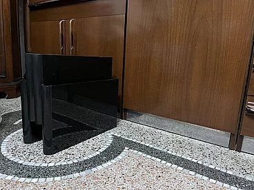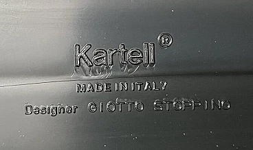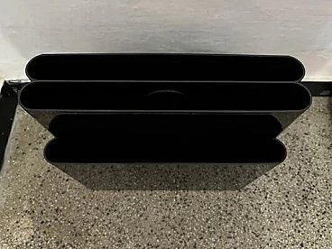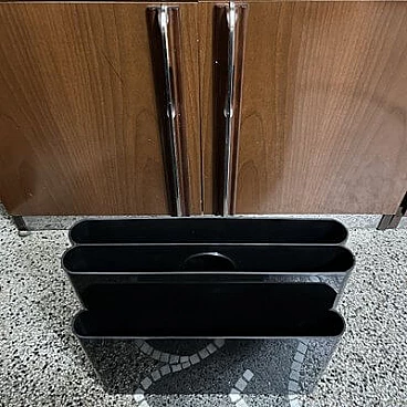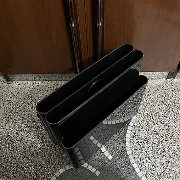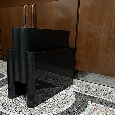 Iconic Space Age magazine rack in black plastic designed by Giotto Stoppino for Kartell Italia in the 1970s, model 4626. A classic of Italian design, a timeless silhouette that does not lose its modern spirit. This version has four compartments, with a handle in the centre that allows it to be raised. Used, it has been cleaned and polished with passion and love, and is in excellent condition, with slight signs of wear that give it the right vintage look. The bottom bears the Kartell logo, as shown in the photo.