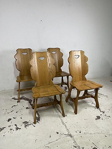 Set of four hand-carved wooden chairs in Brutalist style of 1960s Italian manufacture. The chairs have been carefully cleaned and are in good condition with minor marks. Measurements 99 x 47 x 53 (seat height 45) cm.