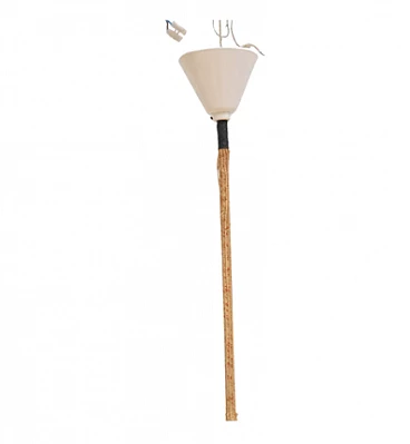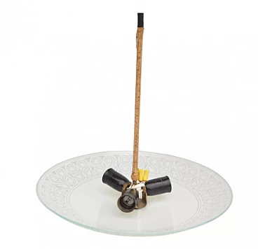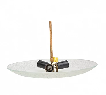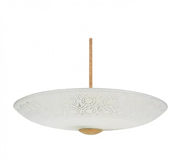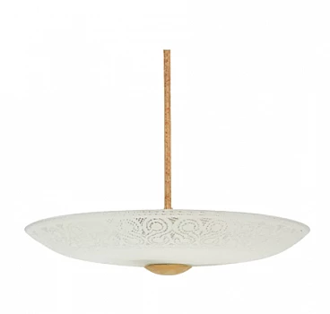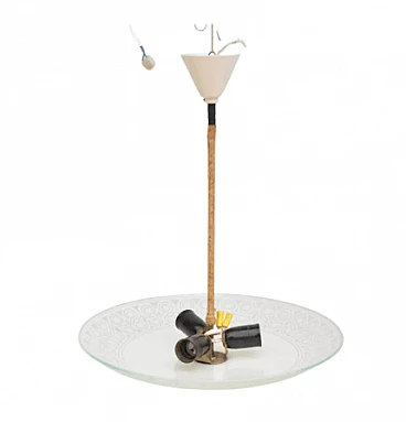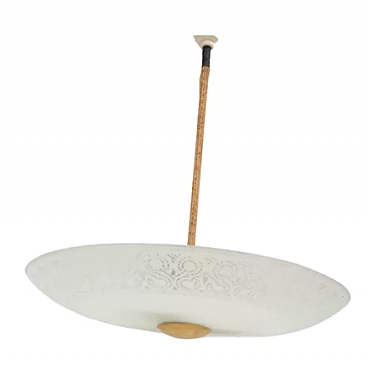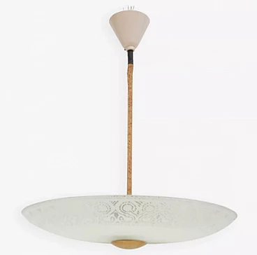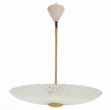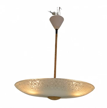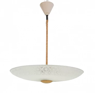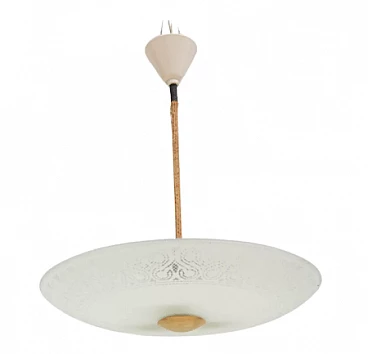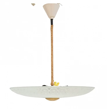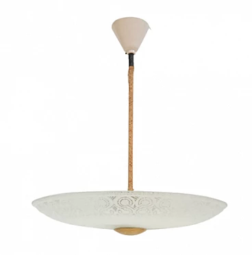 Brussels style decorated glass chandelier by VEB Narva Luchten (Germany), 1950s-60s. Round glass shade decorated by hand with geometric motifs hanging on a steel arm with braided rope; brass lampshade mounting. The object is in good condition, fully functioning. It requires three E27 bulbs up to 60w. The lampshade is undamaged, there is minor damage to the arm weaving. Height of the lampshade alone: 7 cm.