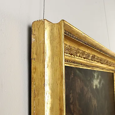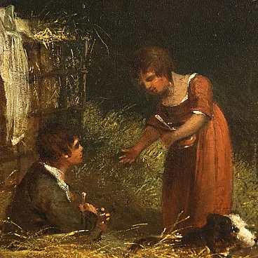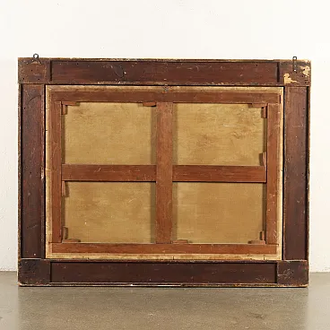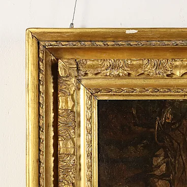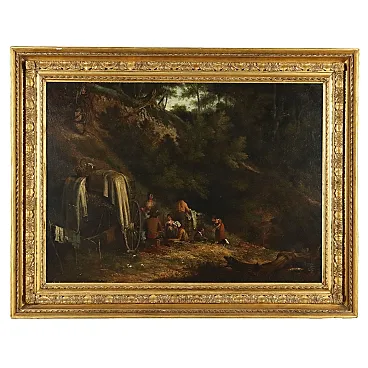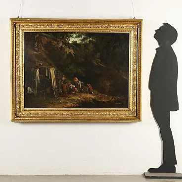 Scene of resting in the woods. Oil on canvas. The large scene with a veristic subject, is set in a dense forest where, near a spring, a small family has stopped for a rest stop: having left the wagon with their belongings (without a horse, therefore pulled by hand!), a man, a woman and a large group of young children, are resting, eating, refreshing themselves at the spring and playing. From the top left, a ray of sunlight filters through the trees, which goes to illuminate the group of figures placed in the center below, the protagonists of the scene. The painting is presented in a late 19th-early 20th-century gilt frame.