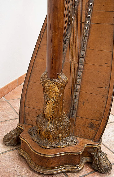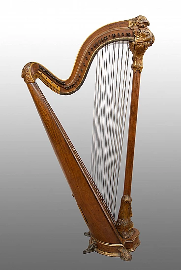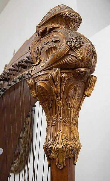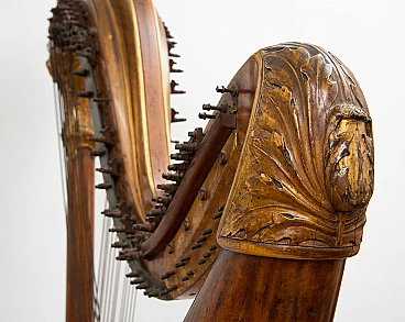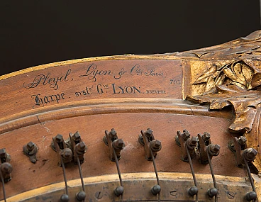 Antique harp made of maple and gilded wood with bronze foot and pedal mounts. On the modillion, near the union with the column, we find the number 793 followed by the inscription Pleyel,Lyon and C.ie (Paris). The entire harp is wood-coloured, except for some gilded carved wood trim that stands out from the rest of the structure. It has seventy-eight strings and the two orders cross about halfway up its height.