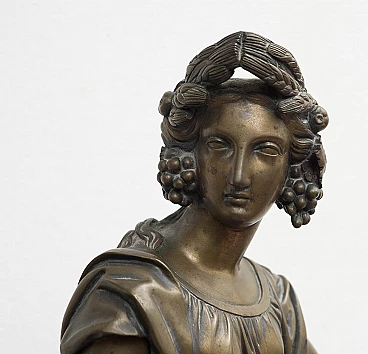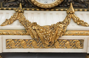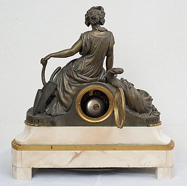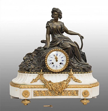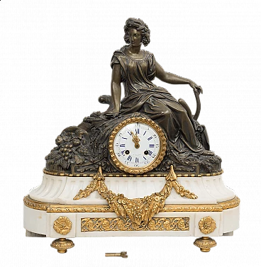 French Napoleon III patinated and gilded bronze and marble clock depicting the allegory of summer, second half of the 19th century (1860-80). The white statuary marble base is adorned with gilt bronze applied decorations in a floral motif and rests on circular feet, also made of bronze. On the upper part is the figure of Ceres, maternal deity of the earth and fertility, tutelary deity of harvests, but also goddess of birth, since all flowers, fruit and living things were believed to be her gifts; a symbol in particular of summer, the season par excellence of harvests. In the composition, which is very harmonious despite its richness of elements, she is traditionally depicted as a young and beautiful woman, holding a sickle in her hand and wearing a crown of ears of corn on her head, which are also found at her feet. The gilding is of the galvanic type. The discovery of the galvanic technique began in 1791 when Luigi Galvani discovered the electrical fluid; this is why all electrolysis procedures are called galvanostegia, a term derived from the surname of the discoverer. Galvanic gold plating is in fact a type of electrochemical process that uses what is known as a galvanic bath: a thin layer of gold is adhered to a metal using electric current. This current carries positively charged gold ions and adheres to the metal, which instead has a negative charge; the result is that a uniform, thin layer is deposited. Mechanism to be reviewed. Signature: Bordon in Montpellier. Item complete with certificate of authenticity. We are at your disposal for further clarification or photographic details. Safe and traceable shipping throughout Italy, Europe and Rest of the World. Shipping will be arranged privately.