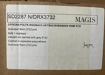 Officina armchair with footstool by Ronan & Erwan Bouroullec for Magis. In the Officina collection, traditional craftsmanship and Italian design harmoniously combine. The ancient technique of iron forging explores a new creative language making the entire collection unique and unmistakable. The imperfection of hand-forged iron combined with industrial manufacturing characterizes the elegance and refinement of Officina. This high-backed armchair is made of forged iron with removable cushions in polyurethane foam covered with fabric. Seat height: 41 cm.