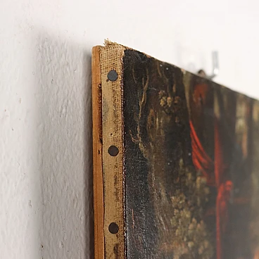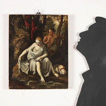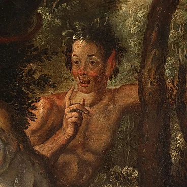French school oil painting on canvas from the 18th century depicting Diana at the bath spied by a faun. The mythological subject of the goddess Diana at her bath was widely used in 18th-century painting and, particularly in the Flemish area, also in the previous century. It was proposed in several variants, with the goddess alone or accompanied by nymphs or with Actaeon; in this case the beautiful deity, recognizable by the quiver hanging from the tree branch and the accompanying hunting dog, is about to bathe in a pool of water while behind her a mischievous faun spies on her. The half-naked female body occupies the entire scene, central and of a whiteness that stands out amidst the shadows of the leafy forest, with all the other figures and elements surrounding her. The small painting was restored and restretched in the early 20th century.