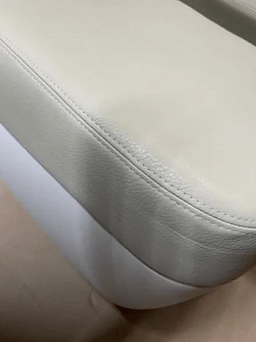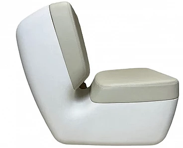 Nimrod armchair by Marc Newson for Magis (2009). Structure in white polyethylene, seat and back cushions in polyurethane covered with ice white leather. Seat height: 40 cm. Nimrod's 70s-inspired retro style is at the same time thoroughly modern; the unique and unmistakable design which takes the shape of a telephone handset, the bold and fun colours, the original and playful lines are its strong points. Marc Newson is one of the most influential and precociously complete designers of his generation: at 37 he had already designed practically any type of object: chairs, objects of various kinds, home accessories, clothing stores, a bicycle, restaurants, a recording studio and the interior of a private plane, demonstrating great versatility and experience. His projects are part of the permanent collections of the MoMA in New York and the Design Museum in London.