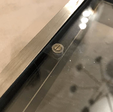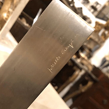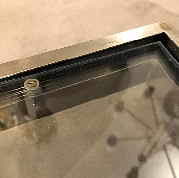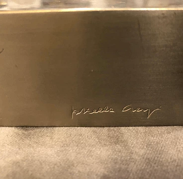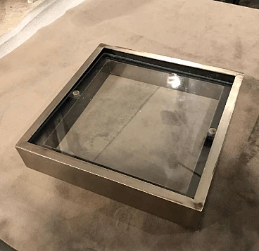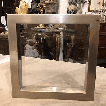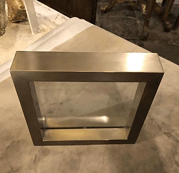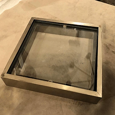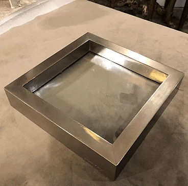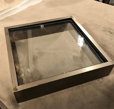 Square metal and glass ashtray by Gabriella Crespi, 1970s. Rare ashtray, which can also be used as a frame, signed by Gabriella Crespi, an illustrious Italian designer. It is made of a square of metal and two plates of glass screwed to it. Designer's signature on one side of the frame. It shows normal signs of use and time. It is a striking and distinctive piece that embodies Gabriella Crespi's unique style, showcasing the designer's talent for blending modernist aesthetics with luxurious materials. The ashtray is square in shape, characterized by clean lines and geometric shapes typical of the modernist design movement. The frame is meticulously crafted using high-quality chrome-plated metal with a brushed finish, adding a touch of sophistication. Inside the metal structure, the ashtray incorporates a glass insert, providing an elegant contrast to the metal structure. The combination of metal and glass creates an intriguing mix of materials, highlighting Crespi's ability to harmoniously blend different elements. Crespi's modernist approach to design is evident in the minimalist and functional shape of the ashtray: the square shape and compact size make it suitable for different environments.