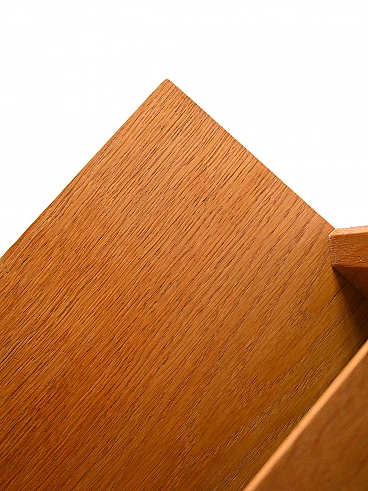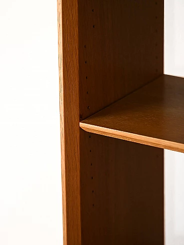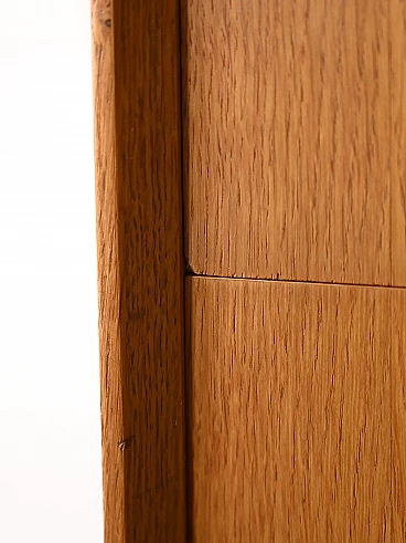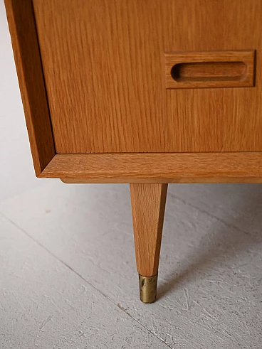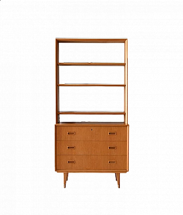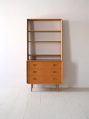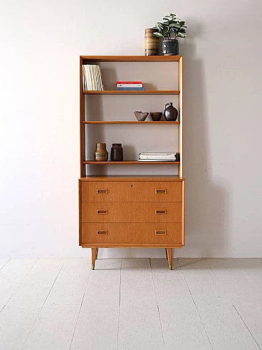 Scandinavian oak bookcase with drawers, 1960s. It combines simplicity of design with everyday functionality. The cabinet features three drawers with carved wooden handles. The open, airy top shelves provide ample space for books or decorative items, while the cabinet's solid structure ensures stability and durability. The slender, sloping legs enhance its elevated design, typical of the style of the period. A conservative restoration has been carried out with products of natural origin. It may show signs of time. Pay attention to the photographs for more specific details.
