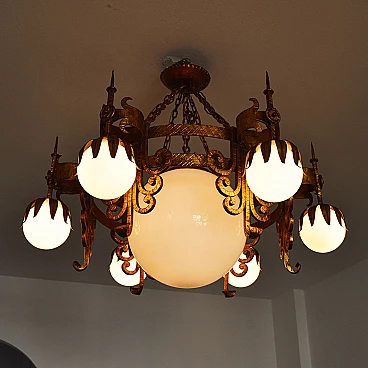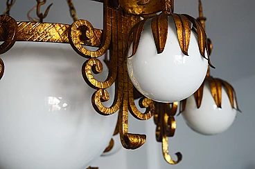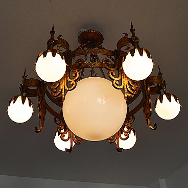 Spanish wrought iron and white opaline glass chandelier, 1950s