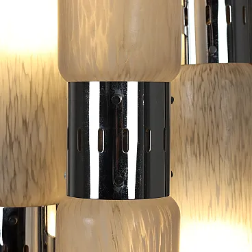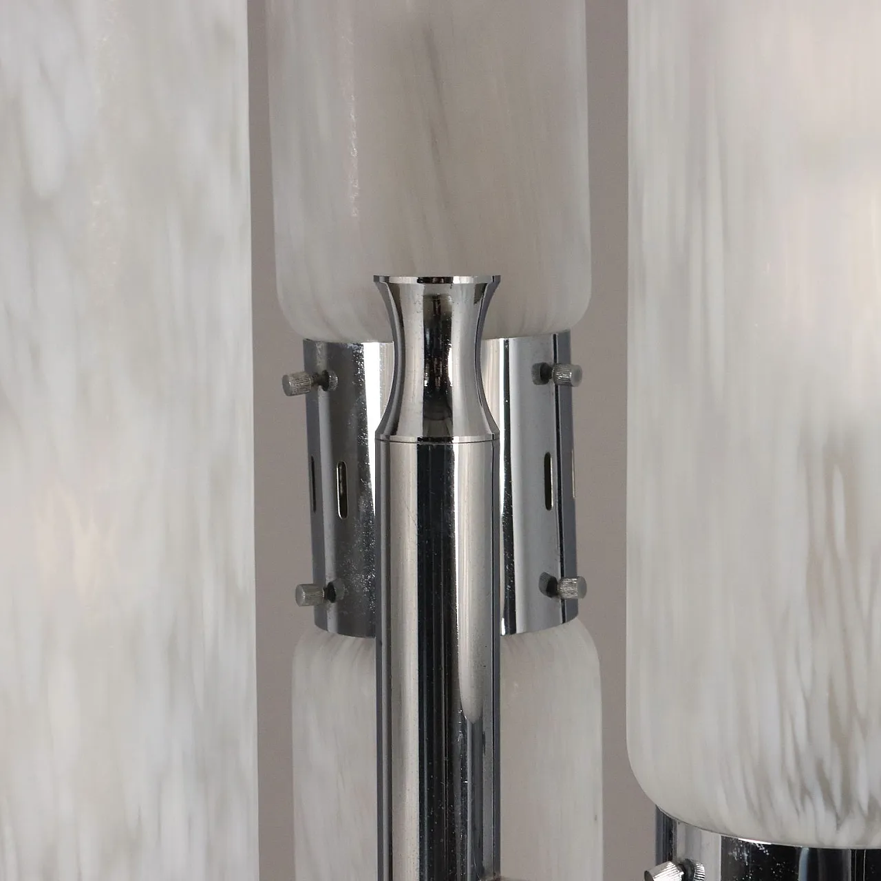 Floor lamp with dual ignition in chrome-plated metal and aluminium and blown glass.