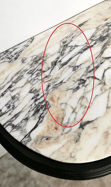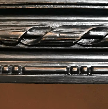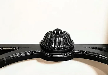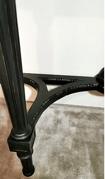 The entire structure is in black painted oak wood; the top, which supports the marble top, has the classic hand-carved Napoleonic decorations on the edge; the four legs have a smooth body and are tapered towards the bottom; the rear legs, in the lower part, are joined by a long crosspiece which, in turn, connects to the front legs with semicircular elements, thus creating a sinuous and light movement which makes the entire piece of furniture stable and solid, capable of supporting the weight of the marble top. Remarkable and refined is the leaf decoration, also carved, placed at the central intersection of the crosspieces. The type of marble used for this console is very important, it is in fact Arabesque Carrara marble.