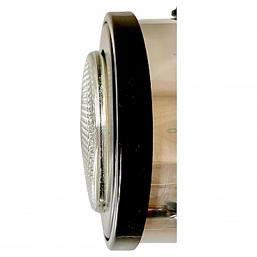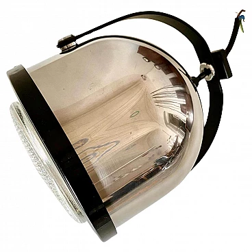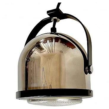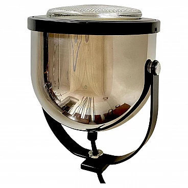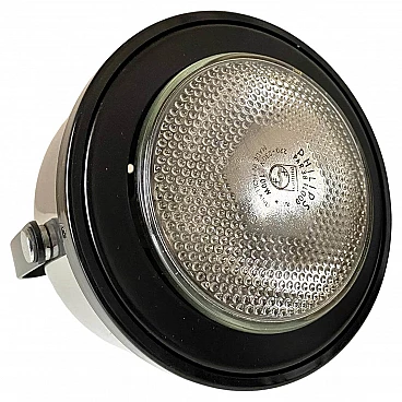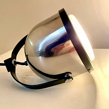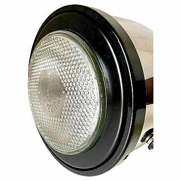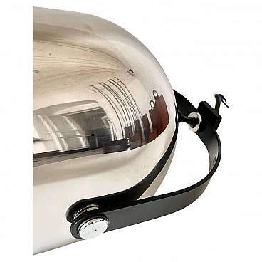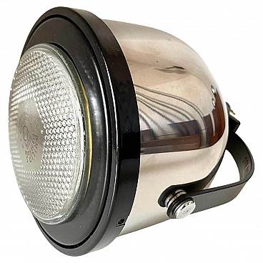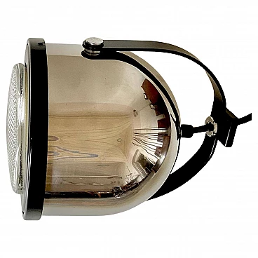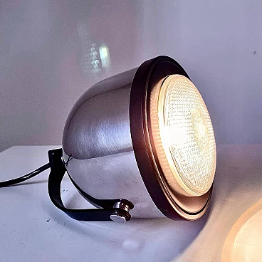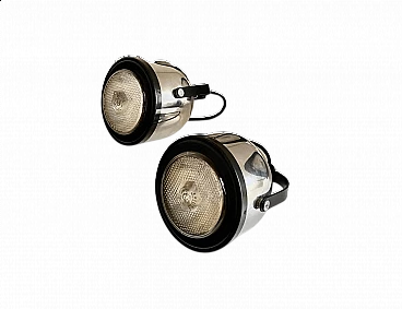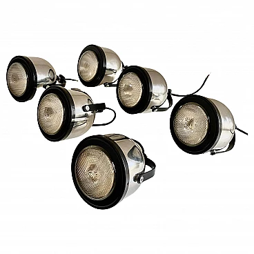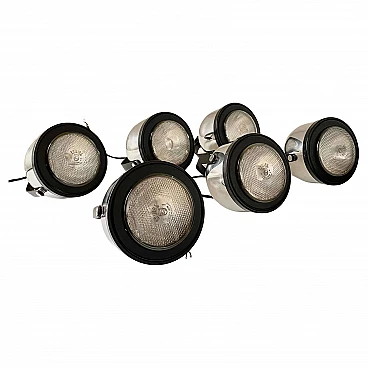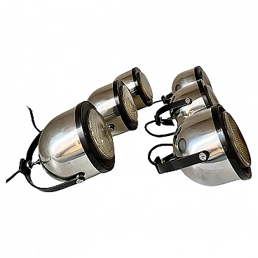 Pair of wall lights by Gae Aulenti and Livio Castiglioni for Stilnovo, 1970s. Chromed aluminum body with black metal structure. Six lamps available in total but sold minimum in sets of two (three lots available, price per pair of lamps). Flexible lighting system that allows the lights to be pointed in any direction. If desired, they can also be used as ceiling lights. The original wall plate is missing; six black metal plates like the original ones are available upon request. Philips model PAR 38 glass globes; all working. In excellent condition with only a few signs of time.