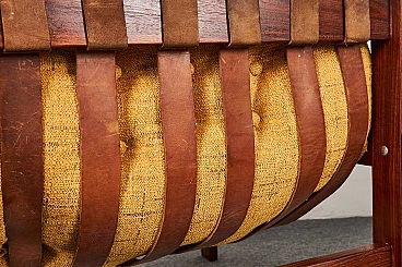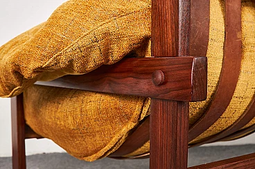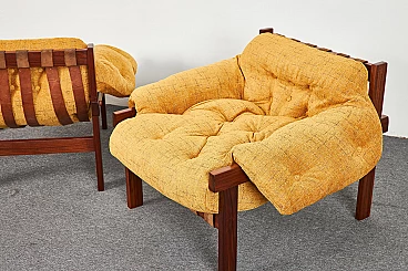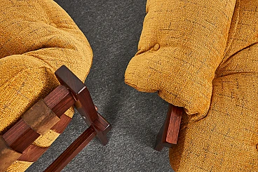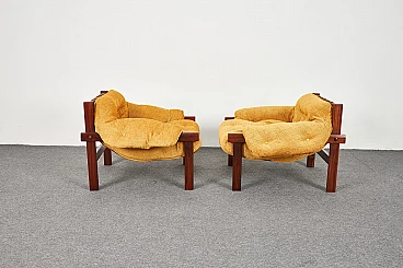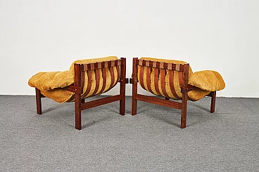 Pair of Brazilian-style Balassa armchairs by Ipoly Furniture Company, 1970s. Clear and well-known design harking back to Percival Lafer. Great for those who don't like leather seats: they feature high-quality Italian Jaquard Silk velvet upholstery; they also have original leather straps and solid mahogany wood structure (treated with multiple layers of oil).