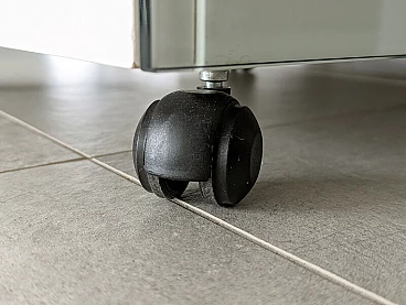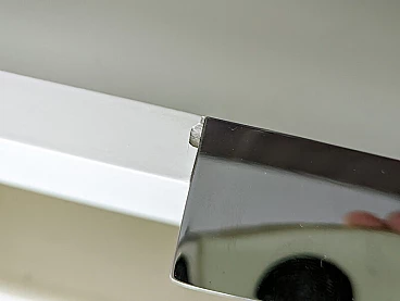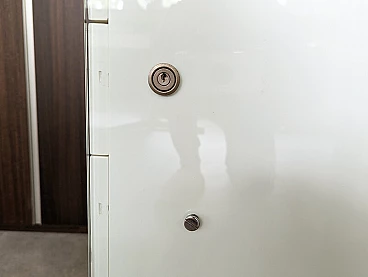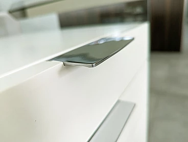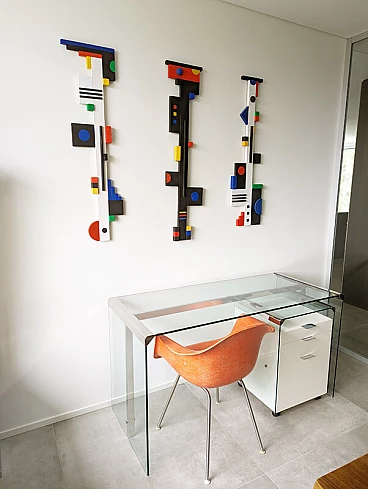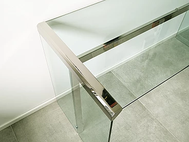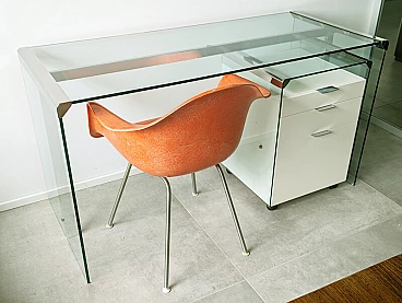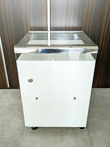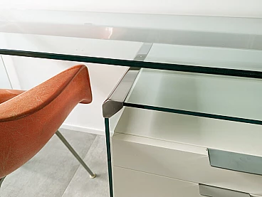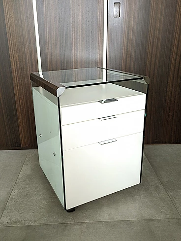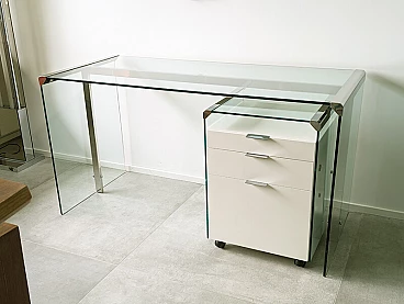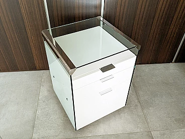 Minimalist desk with drawer unit on wheels in white lacquered wood, thick-cut glass and chrome-plated metal. Minimal and elegant desk with drawer unit on wheels in white lacquered wood, thick-cut glass and chrome-plated metal. Very good overall condition: very slight signs of wear on the chrome-plated parts. Made of glass, it has no particular defects or cracks. The chest of drawers has 3 small defects as shown in the photo. It is equipped with a lock for the drawer block, but the key is missing. In order to be able to use the chest of drawers, the small locks inside the drawers have been removed. It is however possible to replace the lock block to restore the original locking mechanism. Desk: cm 74 h x 139.8 w x 60.5 d, drawer unit: cm 66.5 h x 47.5 w x 47 d.