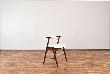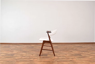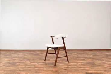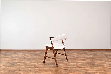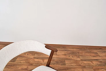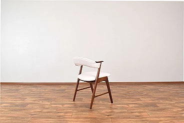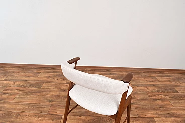 This chair was produced in the 1960s by Korup Stolefabrik. The structure of the chairs is in solid teak and has been professionally and carefully restored by removing old coverings, stains and finishing with varnish. The seat and backrest have been covered with a beige fabric composed of a mix of linen, cotton and viscose, whose texture recalls the materials originally used in the 1960s. The lining sponge was also replaced.