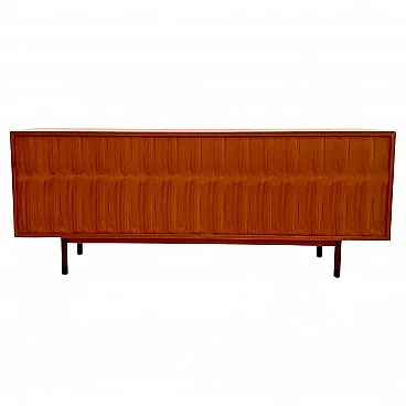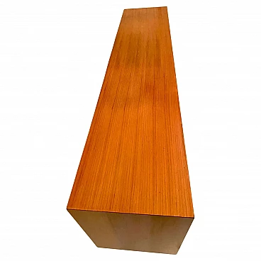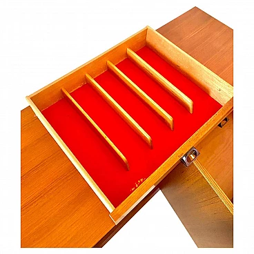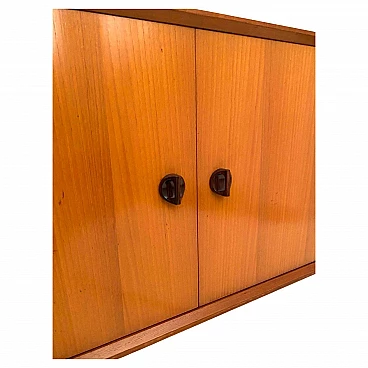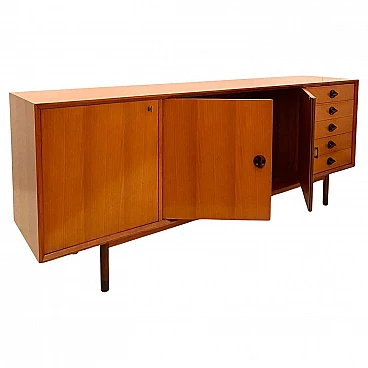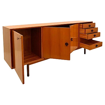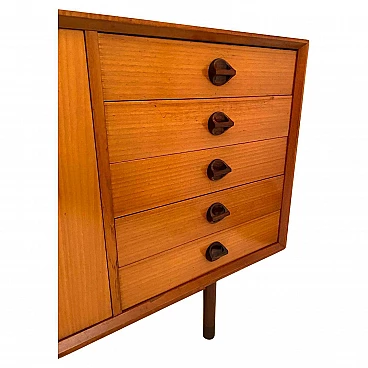 Large sideboard by George Coslin for Faram, 1960s. Main structure made of solid wood veneered in honey-colored beech, knobs and feet in dark wood. It features, from left to right, a single door with key and inside shelf, a pair of doors with inside shelf and dark wood knobs, five drawers also with dark wood knobs. Fully restored: wood has been refined and refinished; drawers have been arranged and are fully functioning. In excellent condition with few signs of time. Visit our profile page to look at our collection of original period pieces, all fully restored. Save on shipping costs for multiple purchases.
