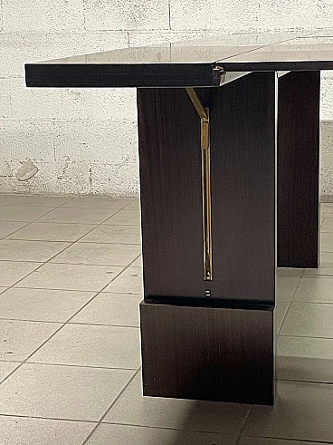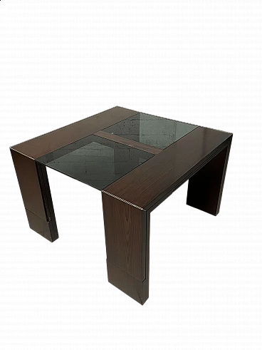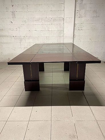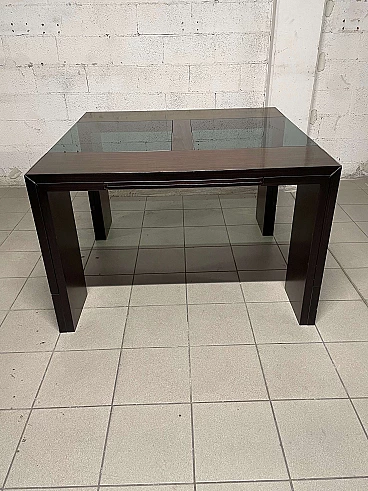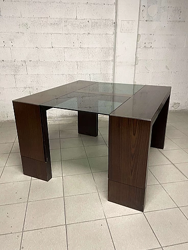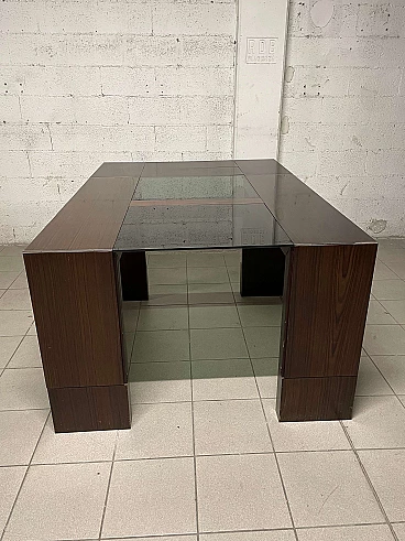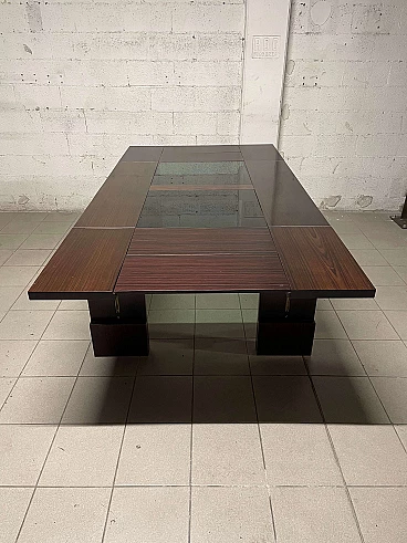 Extendable table from the 1970s with rosewood structure and central crystal inserts which make the aesthetics of this piece of furniture lighter. An easy mechanism allows you to raise two flaps and the extension leaves can be extracted from the sides. Completely open it reaches a width of 231 cm.