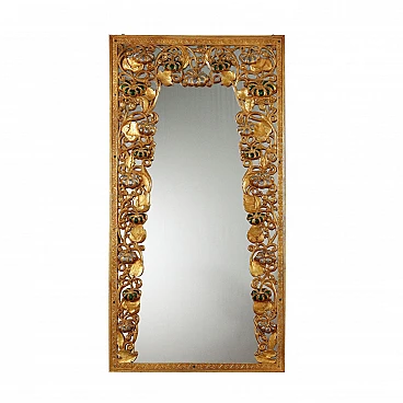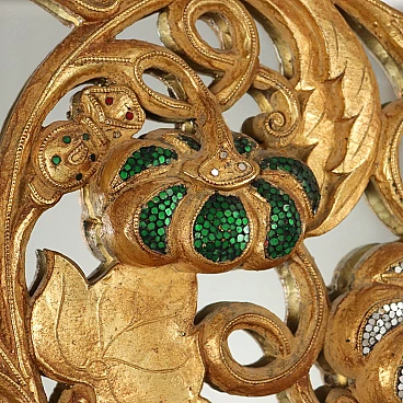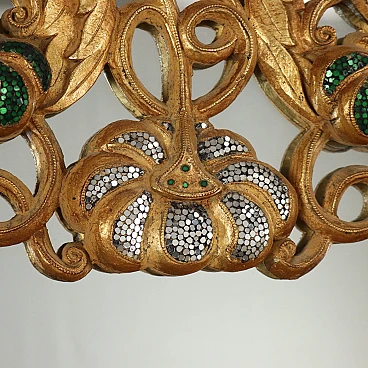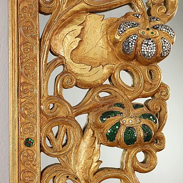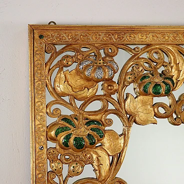 Oriental-style mirror carved with phytomorphic and floral motifs; it is gilded and has details decorated with small mirrors.