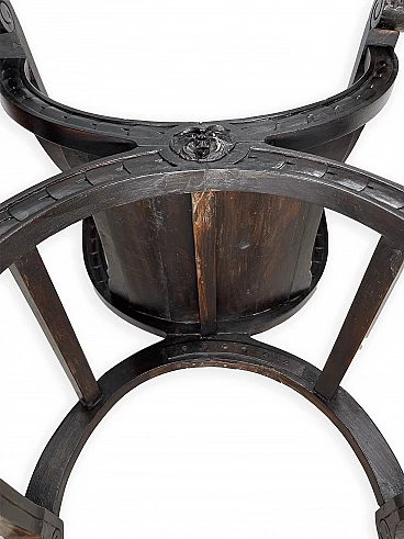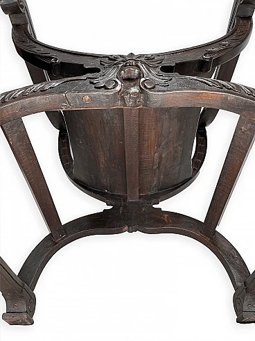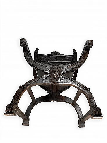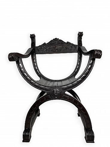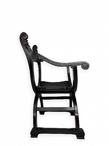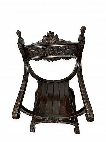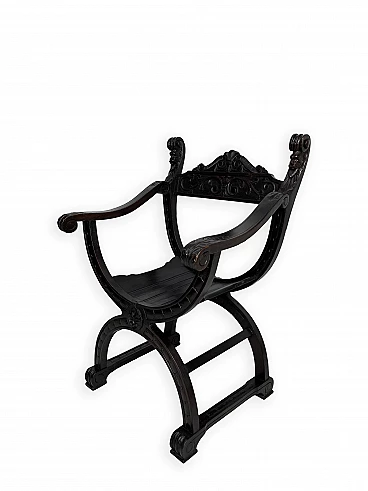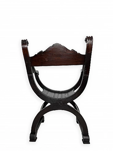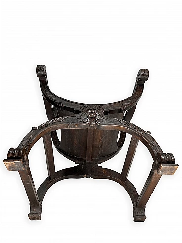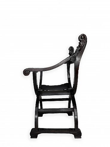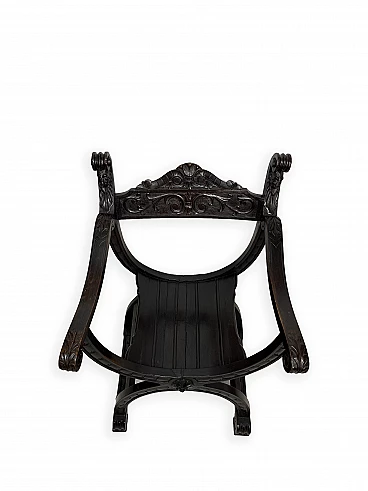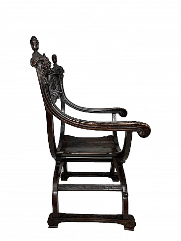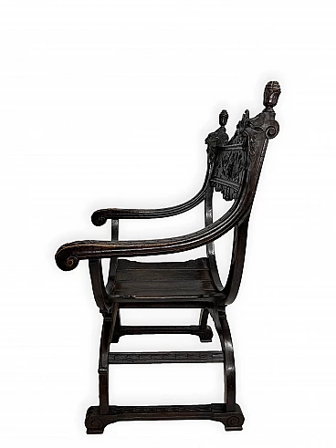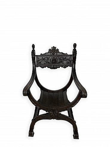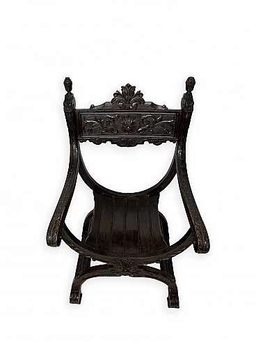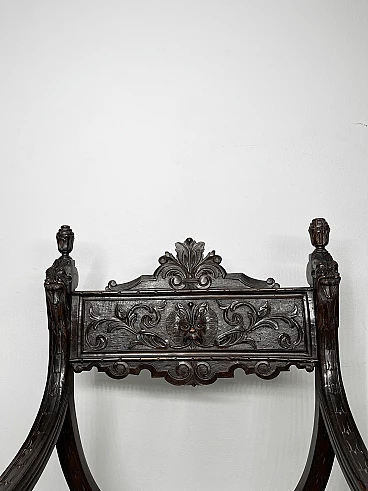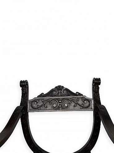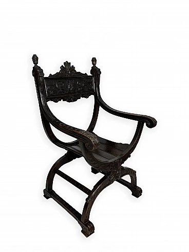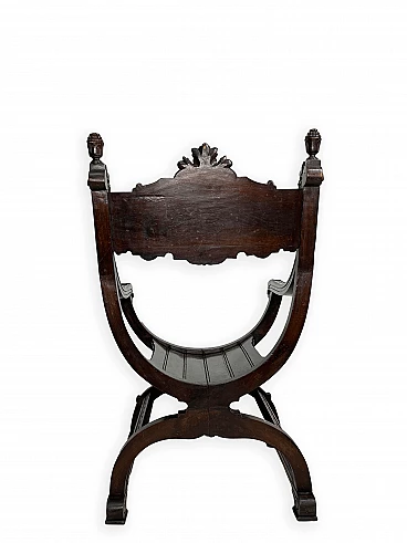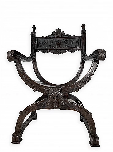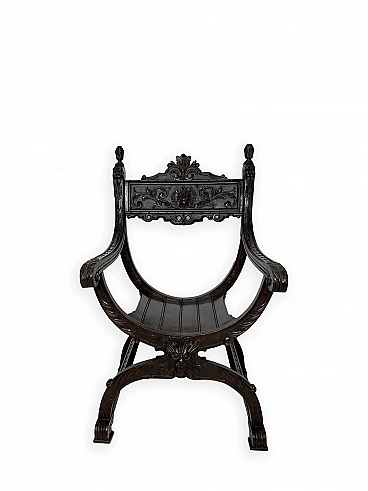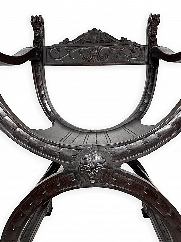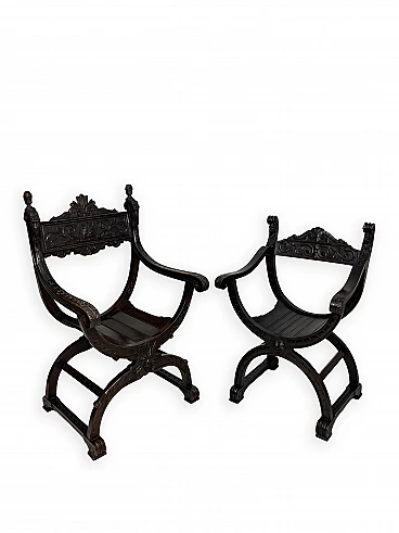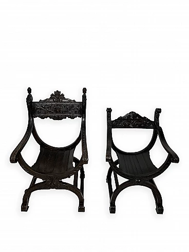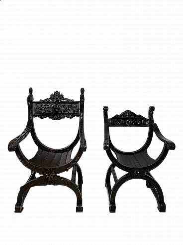 Pair of Renaissance style Savonarola/Dante armchairs of two different sizes, late 19th century (1880-90). The largest, in walnut, has an X-shaped base, decorated with foliage and scrolls, and joined by a grotesque head. The armrests, which extend above the backrest, are carved with fantastic creatures and scrolls and are topped with feathers; the upper part is decorated with the same elements. The seat is in good condition and sturdy. This armchair is in excellent original condition, consistent with age and use. It is 103 cm high, 64 cm wide and 62 cm deep; it weighs approximately 9 kg. Even the smaller one is in Renaissance style; the structure and ornaments underline its representative character. The seat is in good condition and sturdy. This armchair is in excellent original condition despite some cracks which have been repaired (see photos) and which are consistent with age and use. It is 85 cm high, 60 cm wide and 54 cm deep; it weighs approximately 6 kg. Both armchairs have been refreshed with wax.