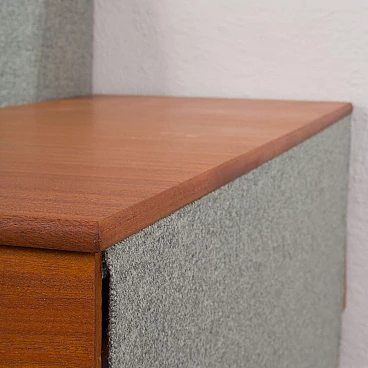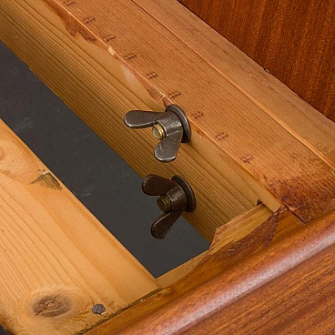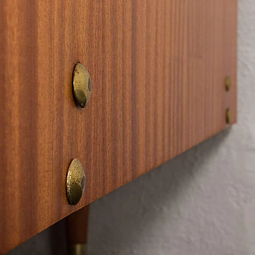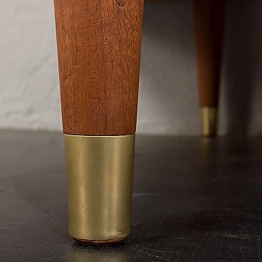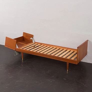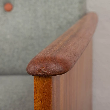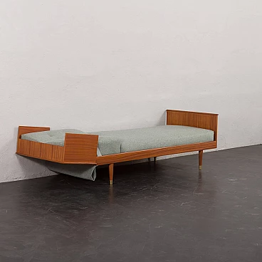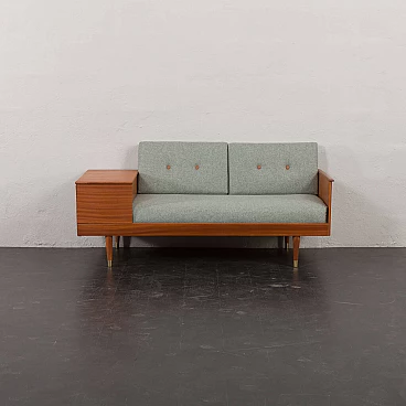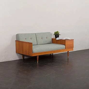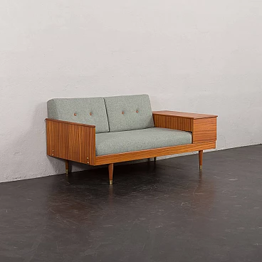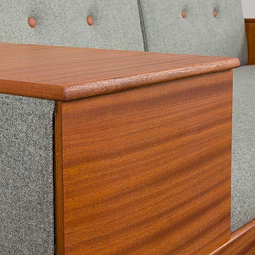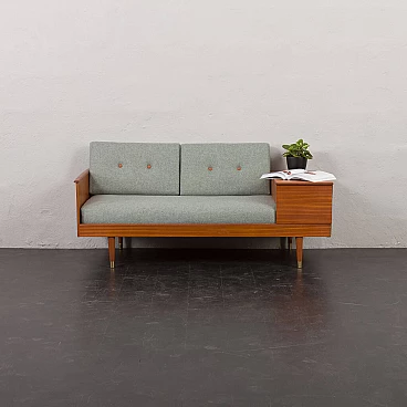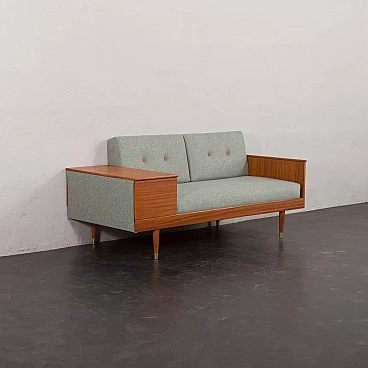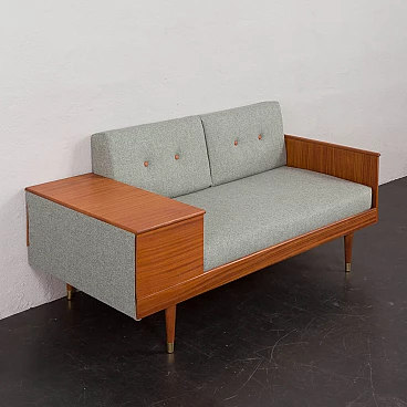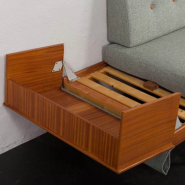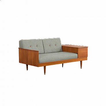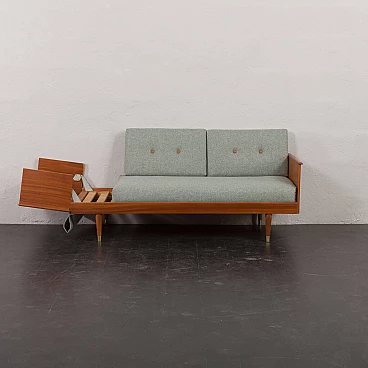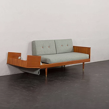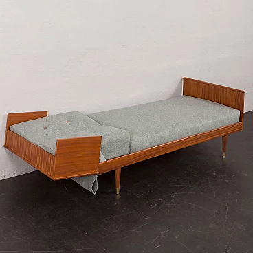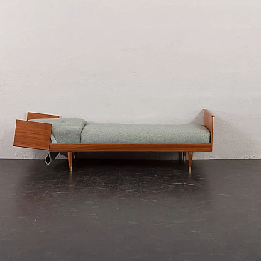 Minimalism and Norwegian purity can be found in this Scandinavian folding sofa bed from the 1960s, closely reminiscent of Ingmar Relling's designs. It is most likely a version of Svane. The daybed fits perfectly in any living room, office, guest room or children's room. It is both a two-seater sofa and a bed, as it offers a sleeping function when fully unfolded. The table can be easily moved up and down, leaving space for two back cushions to create a bed over 197 cm long. The sofa is double-sided, which means that the coffee table can be placed on the right or left side. The mahogany frame with ribbon stripes, combined with a new grey natural wool upholstery and leather buttons, adds a new look to the classic mid-century Scandinavian design. Tapered legs finished in brass, detachable for convenient transportation. The sofa was restored by our team. We made sure that all mechanisms worked properly. All foams were replaced and covered with a natural wool fabric. The wood was cleaned and refreshed with Danish oil. Some absolutely minor signs of use are visible on the wood just to confirm the age of the piece. Customers from all over the world have already trusted our work and its fruits. If you are new to vintage furniture and design, please contact us for explanations and close-ups of the piece. Excellent condition, with slight traces of use. Additional dimensions: bed fully unfolded: H: 77 / W: 197 / D: 78 cm; table height 56 cm; cushion height 39 cm; side panel height: 57 cm; floor height: 21 cm.