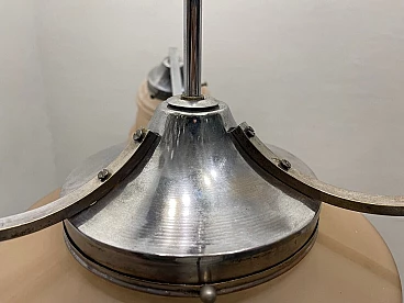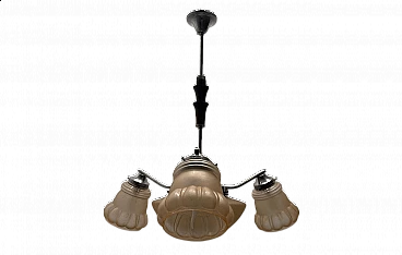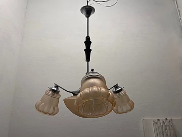 Art Deco pink glass, chromed metal and oak chandelier, 1950s