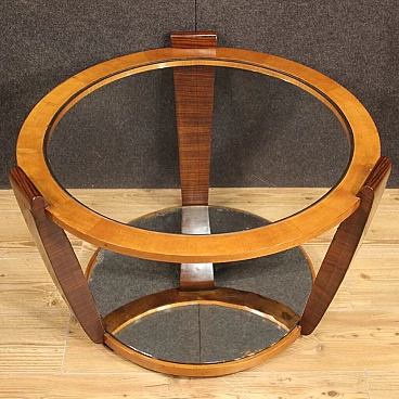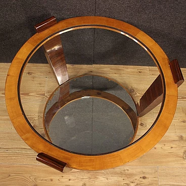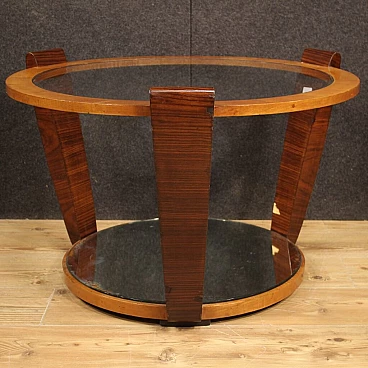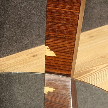 Italian design table of the 60s / 70s. Beautiful line mobile and pleasant furniture in rosewood and cherry wood with double support surface. Upper top in built -in glass which has several scratches and wear signs. Lower floor with mirrored glass that also has this scratch, and shortcomings of mirror decoration on the edges (see photo). Structurally healthy, good service with a top floor of 48 cm height and with a useful diameter of 78 cm. Table supported by three lateral wooden elements veneered in rosewood with several small shortcomings of veneer. Excellent proportion furniture, ideal to be included in a living room or study. In fairly conservative state, to be restored.