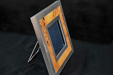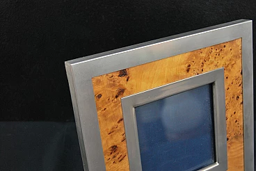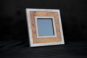 Square picture frame by Tommaso Barbi, Made in Italy, 1970s. A beautiful square picture frame in chrome-plated brass and briarwood from the 1970s. This piece was designed by Tommaso Barbi and bears his signature on the back. The photo frame has a beautiful poplar burl with two chromed metal frames. The contrast between the frame and the briar creates an elegant combination. There is the glass where the photo will be placed. The shipping cost is for the Italian peninsular territory only.