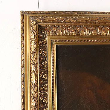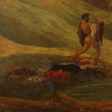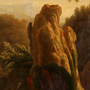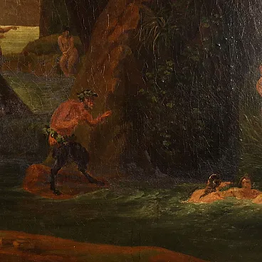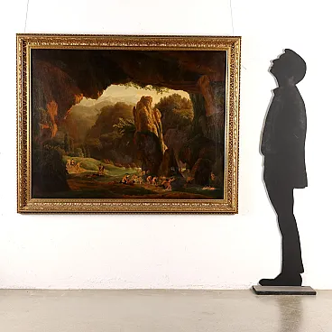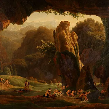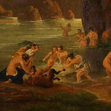 Nymphs and satyrs at the bath. Oil on canvas. On the back is a period cartouche with French inscription "Academic Landscape; The Bath of the Nymphs Disturbed by Satyrs" and attribution to Hippolyte Lebrun (French painter working in Italy during the first half of the 19th century). The large scene is framed, as a backdrop, from inside a rocky cavern in the middle of a verdant and shady little valley. In it flows a river to form pools of water, within which a group of nymphs bathe, disturbed by some satyrs, who chase and undermine them. The scene actually has a very playful character, like a mischievous entertainment between the different characters. The figures, small compared to the landscape, are an added component, enhancing its character of serenity and pleasure; the reference to classical culture is consonant with the period of neoclassicism. The painting shows traces of restoration. It is offered in a styled frame.