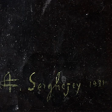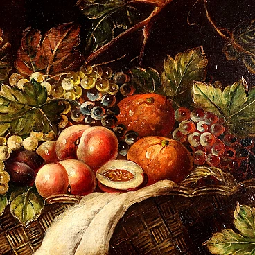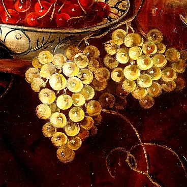 Still life with fruit and tabeware. Oil on canvas. Signature and date at lower left. The composition looks to 17th-century productions and offers a table richly set with trays of fruit, baskets of cherries, baskets with peaches and bunches of grapes with decorative vine shoots, bowls with seeds, and chalices, surmounted by a drapery and resting on a cloth. Color was used in a strongly textural manner in some places, to emphasize for example the stems of grape vine shoots, or to create the reflections of light on the fruit. The painting presented in a styled frame.