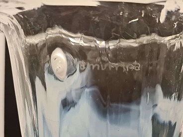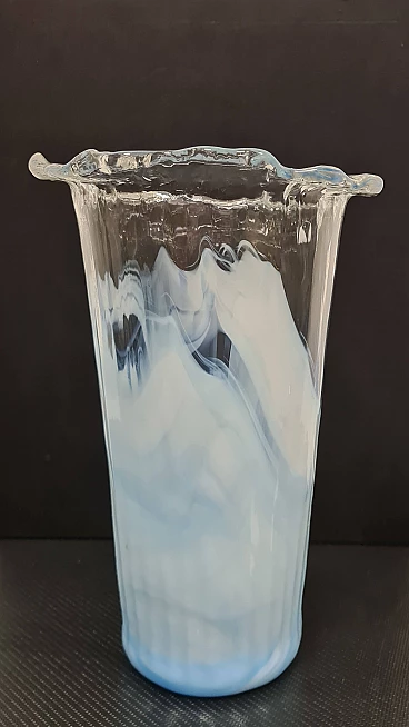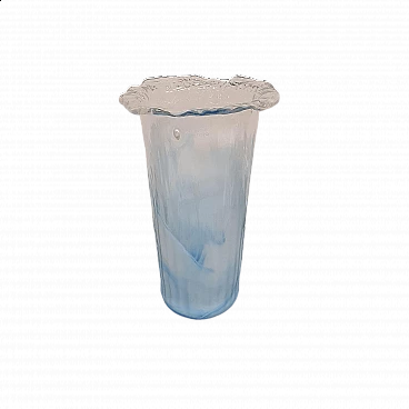 Hand-blown Murano glass vase by La Murrina. Refined vase with a jagged edge, with a baby blue glass base that gradually becomes transparent towards the edge. This model was created in the 1980s by the famous Venetian glassmaker La Murrina, of which it features its signature as shown in the photo. This elegant and sober vase can be placed in any environment thanks to its neutral tones. The vase is new without any type of defect. La Murrina S.r.l. was born in the early 1960s in Murano as a small furnace managed by a group of master glassmakers. The aim was to create a few prestigious pieces designed by the masters themselves. Over the years it underwent changes of ownership aimed at expansion. The turning point came in the early 2000s with the start of collaborations with designers that would increase their fame and prestige.