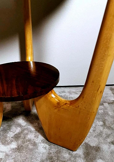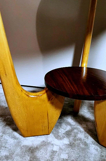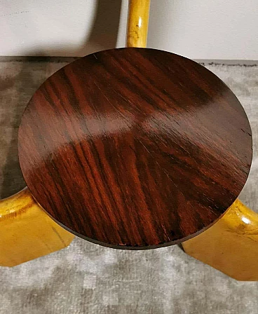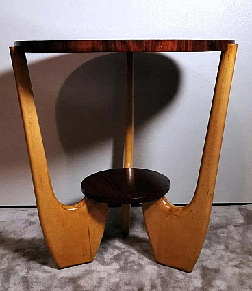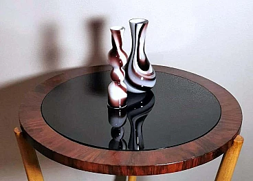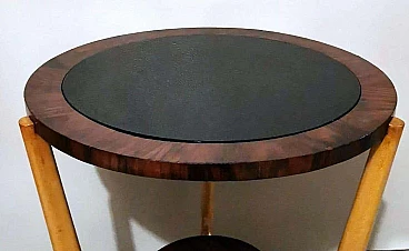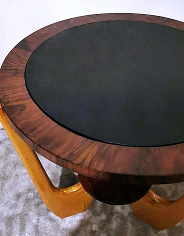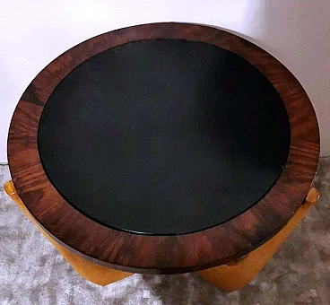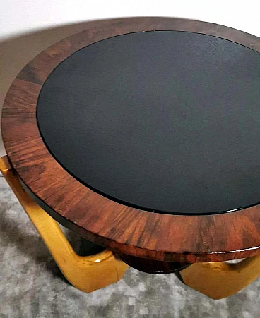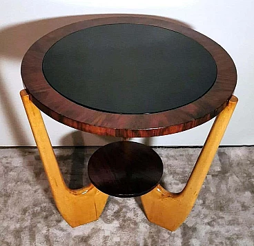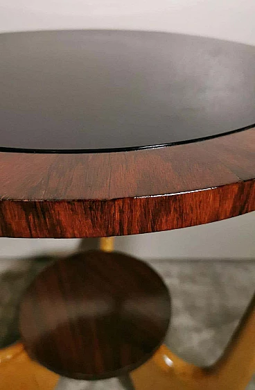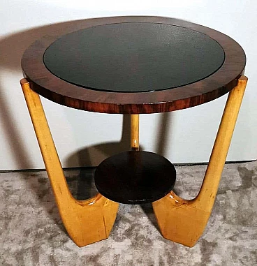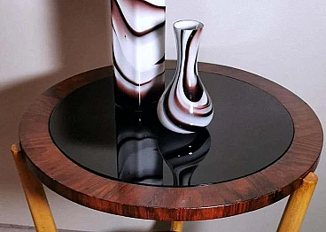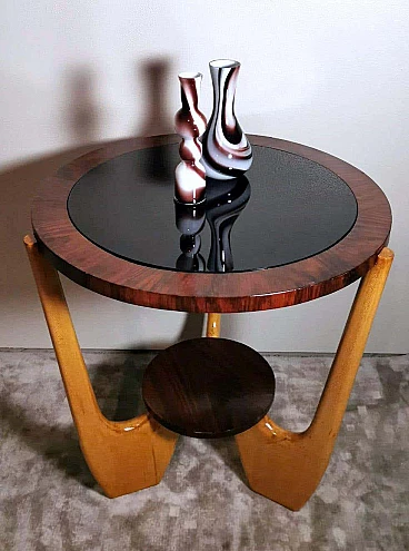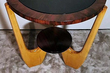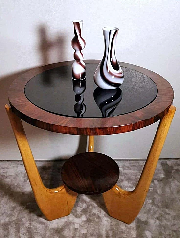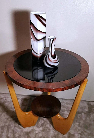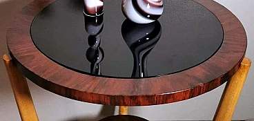 Elegant and characteristic Italian coffee table in Art Deco style. The circular top is made of Sapele wood and is enriched by an elegant dark smoked glass. The small lower table top is also circular and also made of Sapele wood. The two tops are connected by three light cherry wood legs, which with their graceful and harmonious design create an aesthetically pleasing and sophisticated whole. The coffee table was handcrafted in Paolo Buffa's style between 1950 and 1955 in Brianza, a historic area of Lombardy known for its designer furniture made with great craftsmanship. We know for a fact that architect Buffa used Lombard cabinet-makers of recognised skill for the construction of his furniture, who used very refined materials also because the objects were mainly destined for the flats of the wealthy Milanese bourgeoisie. Our coffee table, with its quality, accuracy and finish, was almost certainly made by one of these master craftsmen. Paolo Buffa (1903-1970) was an Italian architect and designer known for his mid-century furniture. Characterised by a fusion of tradition and modernity, he used a combination of low-profile and rectilinear shapes in precious woods to produce his most classic pieces. Paolo Buffa began working in Gio Ponti's studio and later, from 1928, in close collaboration with architect A. Cassi Ramelli. He devoted himself mainly to designing furniture, continually proposing new models. More than a forerunner, he was a faithful spokesman of the taste of his time: neoclassical at first and then Novecento. Paolo Buffa was highly regarded internationally for the refinement of his design and the rigour of his execution, demonstrating an all-Italian competence. Before his death in 1970 in Milan, Buffa had been named one of the country's leading designers. Sapele is a prestigious wood with a reddish colouring similar to mahogany, originating from equatorial Africa; this sophisticated material has a dense weave and interwoven fibres, fine and uniform, and a good natural lustre; it is a robust, rather flexible, hard and compact type of wood, usually used for luxury furniture and cabinet-making, but also in yacht and boat furnishings, as well as in sophisticated and expensive musical instruments. Cherry wood is particularly used in northern Italy as solid wood (by solid wood we mean that portion of the wood that is extracted from the heartwood, the innermost part of the trunk). It has an excellent aptitude for finishing, which is why it is varnished naturally, so as not to compromise the beauty of the grain. The finish is brilliant whether treated with beeswax or shellac, treatments that enhance its warm and pleasant colour. With the combination of these precious woods and the black crystal, the craftsmen have created a charming, refined and captivating piece of furniture that, by virtue of its extreme elegance and soft, romantic line, makes it versatile and easy to place in any environment. The coffee table has been hand-treated using ancient restoration techniques by our team of craftsmen and is in excellent condition. It measures 55 cm in diameter, 60 cm in height. For all our shipments we use special packaging materials (custom-made wooden crates, polystyrene, etc.) for maximum protection and safety of the items.