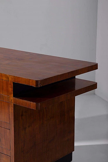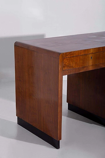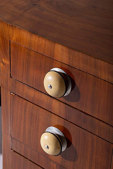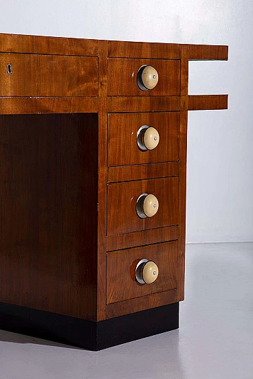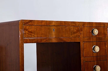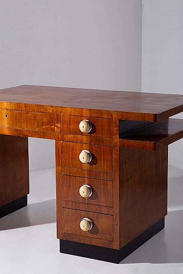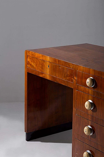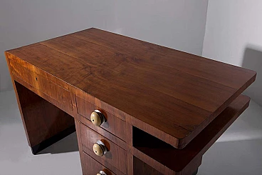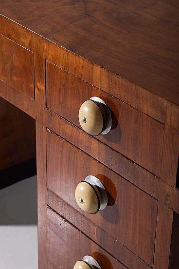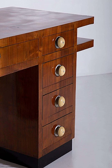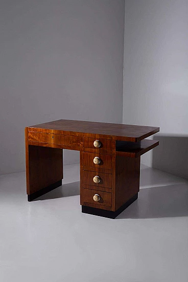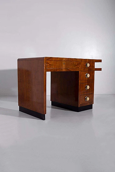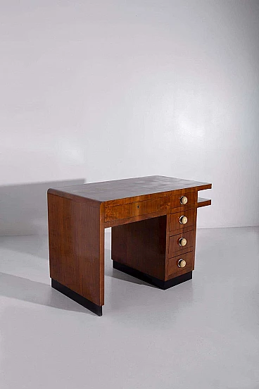 Here is a desk of timeless elegance, an exquisite creation of the Rationalist period in Italy. Crafted with meticulous precision, this Italian desk perfectly combines the warmth of wood with the elegant charm of aluminium metal. The wood chosen for this masterpiece boasts a captivating grain that dances in the light, telling a silent story of the art of nature. Its inherent elegance is undeniable and draws the eye and heart into a realm of aesthetic delight. When one's gaze explores the shape of the desk, one cannot help but be captivated by the quintessence of Italian rationalist design. It bears its heritage proudly, with lines as sharp as a morning breeze and shapes that exude an aura of order and simplicity. But it is the details that make this desk exceptional. Four round aluminium knobs, painted in a soft and inviting beige, embellish the front of the desk, serving as both functional drawer pulls and exquisite ornaments. Anchored to the drawers with a delicate yet sturdy metal frame, they invite exploration, hinting at the secrets kept within. Under the desk top hides a drawer, a treasure chest that can only be opened with the right key. It provides a refuge for precious objects, keeping them close but protected, a testament to the practicality of the desk hidden in its graceful exterior. Another noteworthy feature is the cleverly placed wooden shelf on the right side. It emerges seamlessly, creating an additional level of utility while retaining its elegance. Every inch of wood, every curve, every line, is a testament to the craftsmanship of the rationalist era. This desk, with its unadorned, immaculate design, is the embodiment of minimalist sophistication. It makes itself desirable in spaces that appreciate the beauty of simplicity, in rooms that whisper stories of history, and in the hearts of those who seek the perfect marriage of functionality and aesthetics. It is a testament to a bygone era, a timeless piece of Italian design that continues to fascinate and inspire.