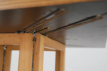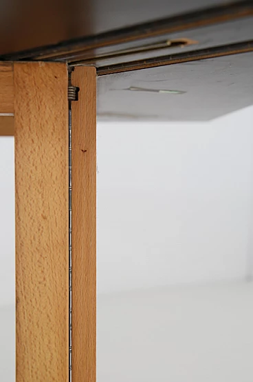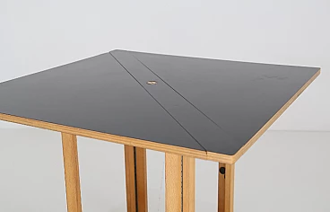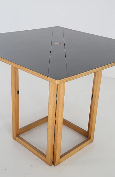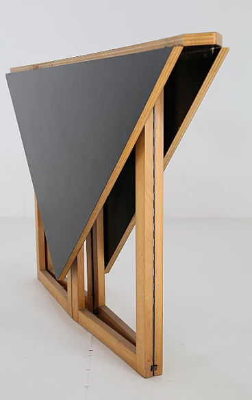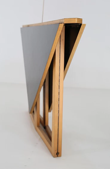 Gabbiano folding table by Pierluigi Ghianda, 1970s. It is called like this because of its innovative opening system. Thanks to the pin located in the center of the top, the table closes and opens easily. Lifting the central pin activates the closing mechanism, thanks to two conductors that activate the metal hinges. The supports are designed so that, once the mechanism is activated, they can close like a wallet to facilitate closing the end of the top. The structure is made of wood while the top is made of formica. The table is supported by four parallelepipeds joined together. The peculiarity is its geometric rigor and executive perfection which make it a practical but at the same time elegant and modern object.