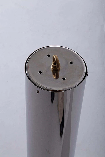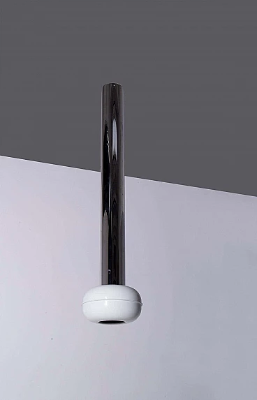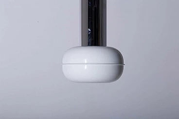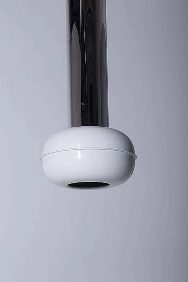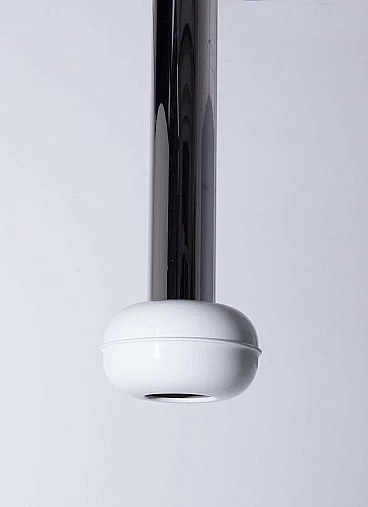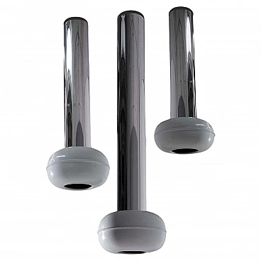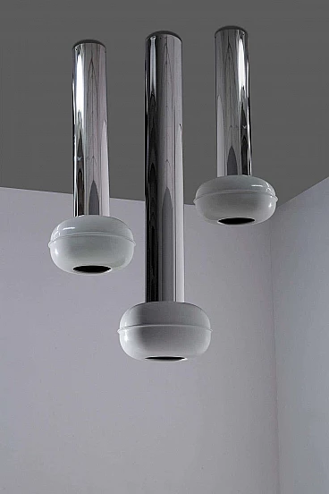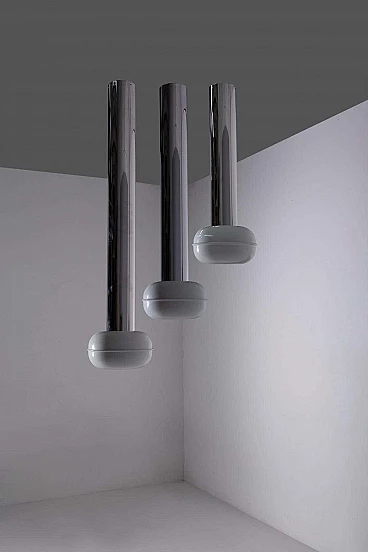 Enter a realm where vintage allure meets futuristic flair with the hypnotic trio of 'Manifesto' pendant lamps (model '19061') by visionary designer Ettore Sottsass for Stilnovo, dating from the eclectic 1970s. Each pendant has a light bulb inside. Made with precision and ingenuity, each pendant lamp is a testament to the limitless creativity and avant-garde spirit of its time. Imagine the sleek silhouette of painted aluminium, shining in immaculate white and cradling the luminous heart of the lamp with effortless grace. Polished tubular aluminium forms the backbone of each structure, reflecting light and space in a dazzling dance of modernity. Observing the set, you will marvel at the diversity of sizes, each lamp a unique embodiment of Sottsass's iconic vision. Anchored to the ceiling by delicate hooks, they hang suspended like celestial spheres, casting a soft, inviting glow that invites you closer. Immerse yourself in the essence of the space age of the 1970s, where linear and geometric shapes reign supreme and innovation knows no bounds. Manifesto' pendants embody the essence of Sottsass's design philosophy: bold, unconventional and utterly captivating. In every space they inhabit, these luminous treasures transform the ordinary into the extraordinary. With their clean lines and geometric allure, they infuse a touch of eccentricity and modernity into every corner, elevating the ambience and igniting the imagination. Whether suspended over an elegant dining table or illuminating a chic lounge area, 'Manifesto' pendants are more than just lighting fixtures: they are style statements, symbols of an era defined by bold creativity and unbridled imagination. Surrender to their enchanting charm and allow yourself to be transported to a realm where past and future converge in a luminous celebration of design. Medium size: height 93 cm, diameter 24 cm. Small: height 73 cm, diameter 24 cm.
