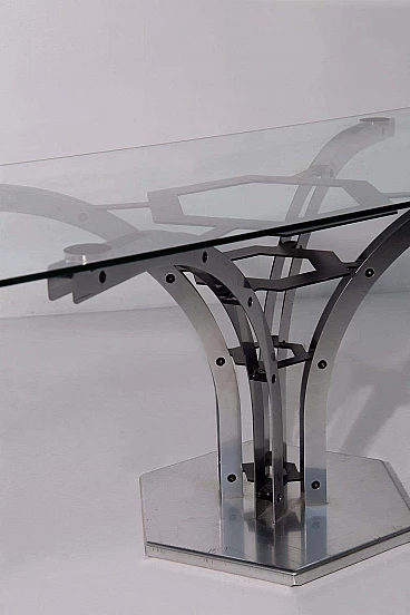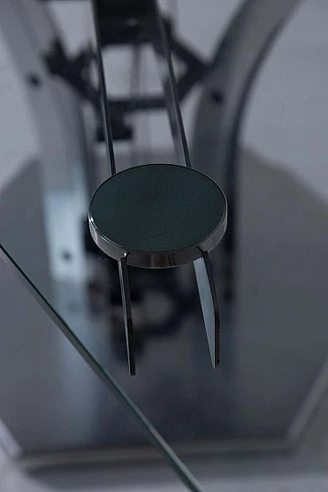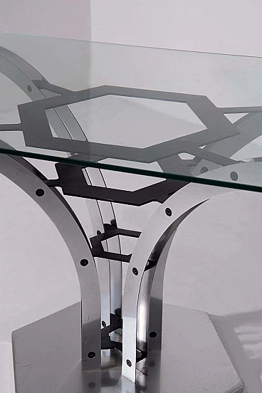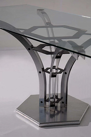 Divided into two distinct sections, the table top features a thick sheet of glass that exudes a sense of modern sophistication. At the bottom, the base and pedestal, made of metal and steel, display precise geometric shapes that form an eye-catching hexagonal scale that rises upwards with an eccentric touch. A fusion of mechanics and design, each element of this table has been meticulously designed, ensuring that its technical prowess is not merely accidental. Atop the pedestal are four metal plates that elegantly support the glass plate above, creating a hypnotic interplay of form and function. This table is not just a piece of furniture, but a statement of bold individuality and avant-garde style. Ideal for living rooms or modern dining rooms that wish to stand out, its eccentricity takes centre stage, infusing the space with a sense of character and personality that captivates all who encounter it.