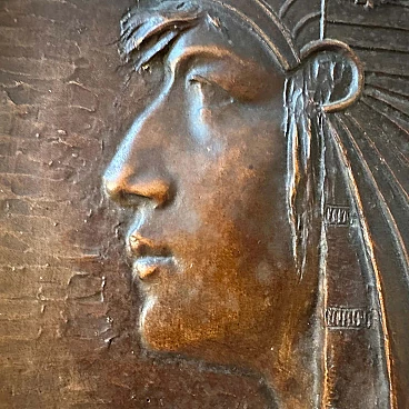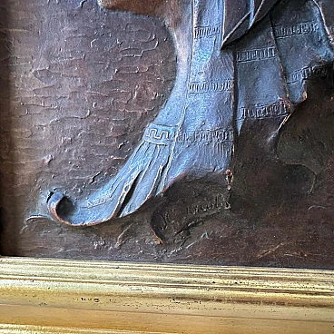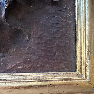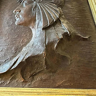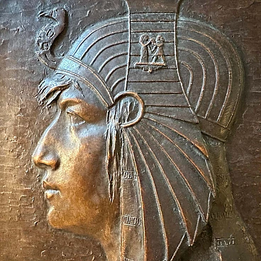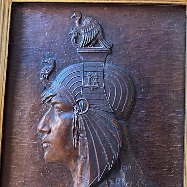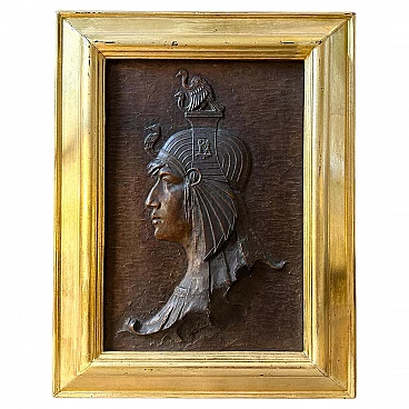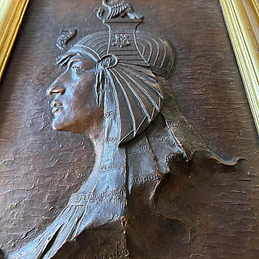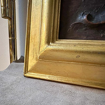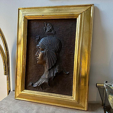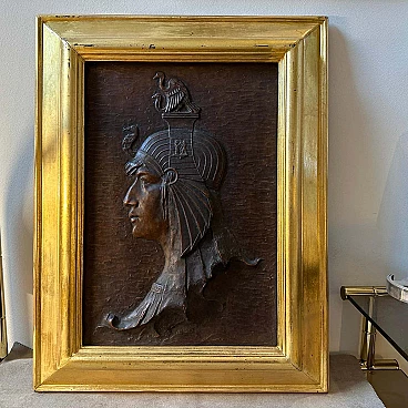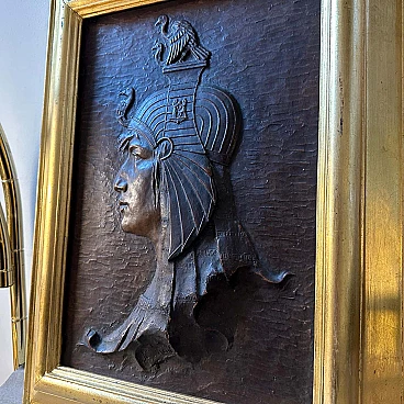 A gilded wood framed Art Deco plaster bas-relief depicting an ancient Egyptian handmade in Italy in the 1930s, representing an extraordinary fusion of artistic and craft influences of the early 20th century. This particular piece embodies the elegance and sophistication associated with the Art Deco movement, characterised by geometric shapes, bold colours and luxurious materials. The plaster bas-relief technique involves sculpting figures or designs on a flat surface, creating a three-dimensional effect that adds depth and texture to the work of art. In this case, the bas-relief depicts an ancient Egyptian hand, evoking the mysticism and grandeur of ancient Egyptian civilisation. This piece reflects Italy's rich artistic heritage and its historical links with ancient civilisations. The gilded wooden frame adds opulence to the artwork, enhancing its visual appeal and serving as a luxurious accent piece for any space. The juxtaposition of the Art Deco style with the ancient Egyptian motif creates a captivating aesthetic contrast, blending modernity with echoes of the past. It is a testament to the enduring appeal of classical themes and the innovative spirit of the Art Deco era. It is in excellent condition, the gilded wooden frame shows small signs of age.