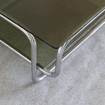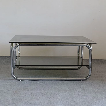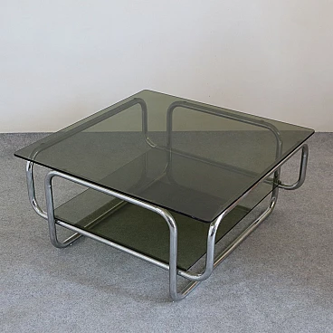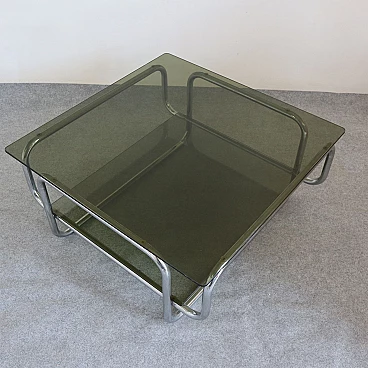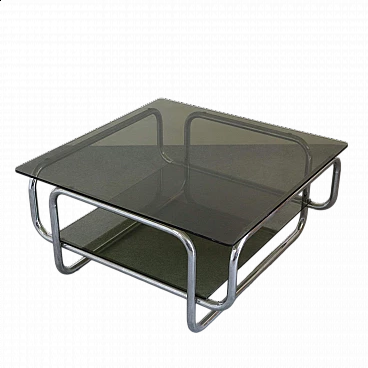 Squared coffee table with double smoked glass. It embodies the spirit of the era, adding a touch of elegance and modernity to your space. The dimensions of 120 x 120 x 40 cm provide ample storage area for magazines, books or a refreshing drink, while the chrome tubular construction adds sturdiness and contemporary style. The smoked glass, with its mysterious reflection, gives a sophisticated and relaxing atmosphere to your environment. It is not only a functional piece but also a work of art that captures the essence of 1970s Italian design.