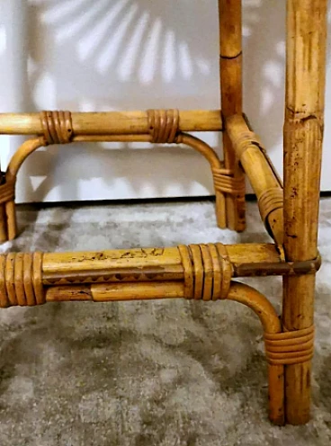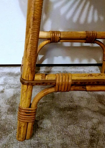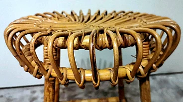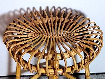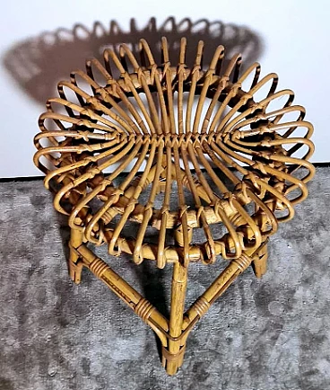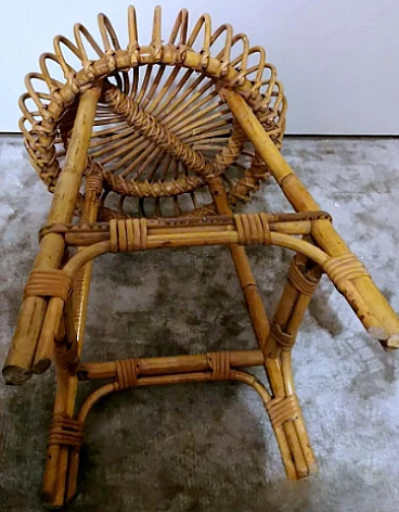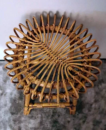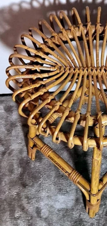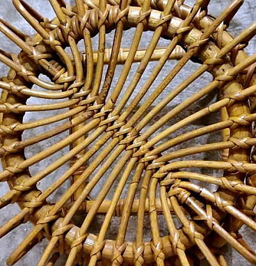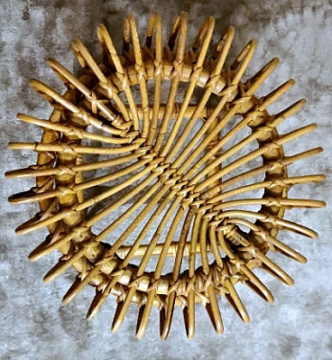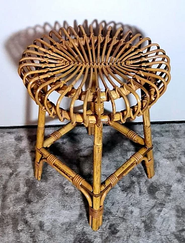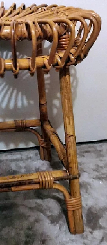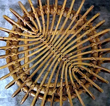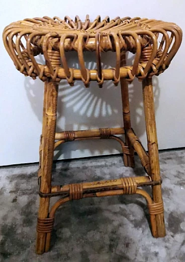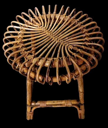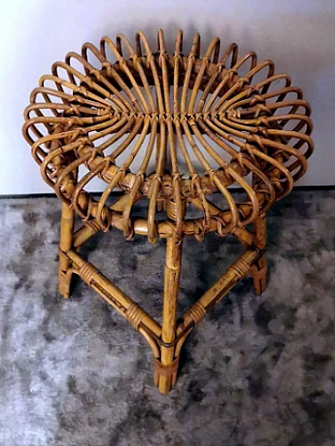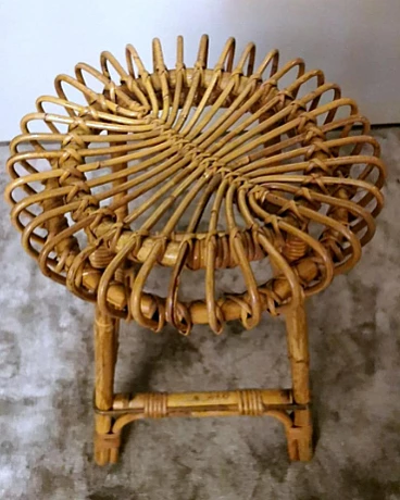 Bamboo and wicker stool by Franco Albini for Bonacina, 1960s. Iconic and distinctive, it is characterized by the large and comfortable round seat from which four solid straight legs start which join in the lower part to give greater stability to the object. Both the seat and legs are made of sturdy thermoformed bamboo, while all sturdy bindings are made of wicker. The whole shape has a light and airy feel. It was designed in the modernist style by the famous Italian designer Franco Albini and created between 1960 and 1965 with extraordinary craftsmanship by the Bonacina company of Lurago d'Erba (Como, Italy). Franco Albini (17 October 1905 – 1 November 1977) was an Italian architect, designer and university professor of neo-rationalist design. A young pupil of Gio Ponti, Albini became one of the key figures of Italian Rationalism in the early 1930s, of which however he gave an interpretation that was in many ways eclectic. It was on the basis of these beliefs that after the war he approached the world of woven fibres, establishing, in 1951, a close relationship with the laboratory of Vittorio Bonacina, a company founded in 1889 by Giovanni Bonacina, Vittorio's father, who, exploiting the art of the ancient craft of basket weaving, he founded his own company, soon expanding his production with armchairs and furnishing elements, specializing in the use of materials such as bamboo, rattan and wicker. The result of this collaboration culminated in the bamboo and rattan furniture presented at the IX Triennale in 1951. The material, traditional and poor, was approached for the first time with a spirit of research and avant-garde, giving life to some masterpieces that have left an indelible mark of Albini and Bonacina in the history of design. Other prestigious Italian companies, such as Cassina, Arflex, Poggi, Arteluce, Brionvega and Knoll, have made use of the active collaboration of Albini, who has been awarded the Compasso d'Oro three times, the most prestigious Italian design award. The tradition of such furniture originated in the United States at the end of the 19th century. The fashion soon spread to Europe and Italy, both in Brianza and in the Po Valley and in Tuscany. From an eminently poor material, it has found itself filling the role of a luxury detail in contemporary design, bringing with it the added value of dozens of hours of manual work carried out by a dying class of skilled craftsmen. The term bamboo identifies a group of very vigorous evergreen herbaceous plants that grow in a tropical or very humid climate; all bamboo species have a common characteristic: a hollow stem, very tall, easily workable and rather rigid. It is used for the production of furniture, chairs, deckchairs, sofas but also household items and even parquet and flooring. Bamboo is a symbol of resistance: it is prized for its ability to withstand storms without breaking, thanks to its hollow, flexible stem and extraordinarily strong roots. It is a symbol of purity, firmness and other virtues. The pith is the innermost part of the rattan cane which is broken down into very thin strips; it is therefore the most valuable and refined part and therefore also the most delicate. Rattan is obtained from Indian cane which, left to dry in the sun on the edge of the forests, takes on extraordinary qualities of resistance and durability. In the outdoor finishing sector it is worked with or without bark. There is also wicker, a material made by intertwining willow branches or other plants. The elasticity and resistance of willow wicker have made it, since time immemorial, ideal for making baskets and baskets; rush is also used for these processes, a small perennial plant found in marshy or maritime areas.