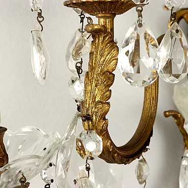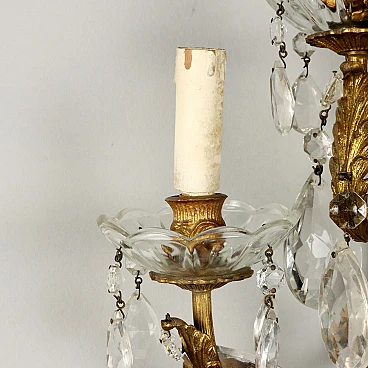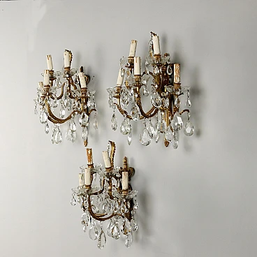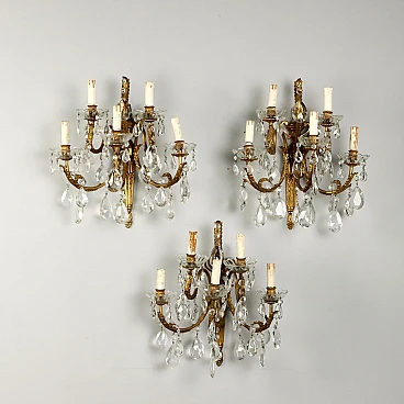 3 Five-light appliques in gilded bronze worked with neoclassical motifs, adorned with glass pendants. Italian production, 20th century.
