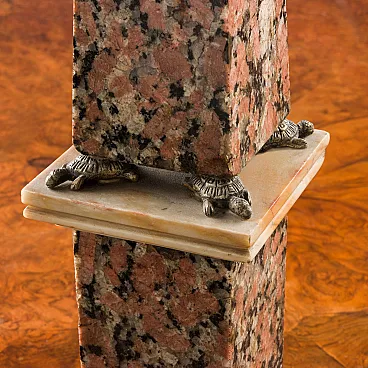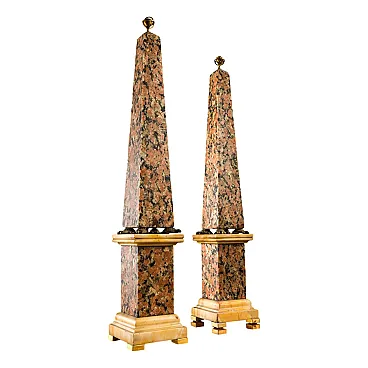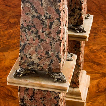 Pair of obelisks in red granite surmounted by two terrestrial and celestial globes in gilded bronze. The obelisks rest on two granite plinths with a base and capital in Giallo di Siena marble resting on gilded bronze feet. The plinths are supported by 4 gilded bronze turtles. The bronze turtles are later embellishments. Italian production, 19th century.