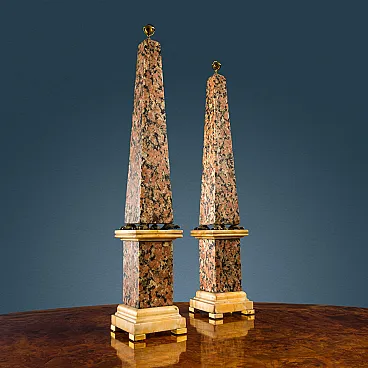 Pair of red granite and giallo di Siena marble obelisks, 19th century