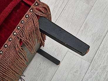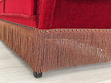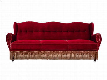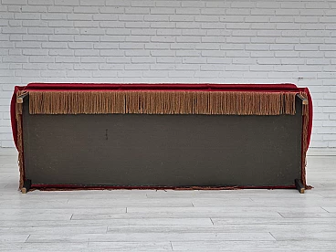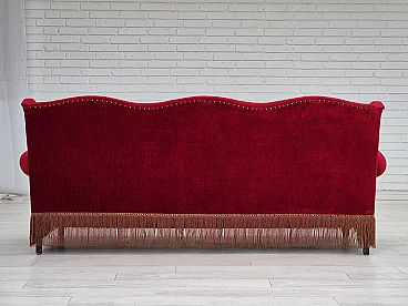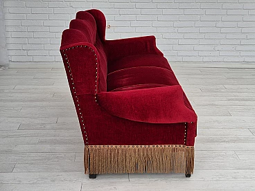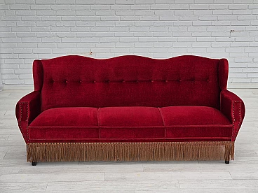 Three-seater sofa made in Denmark circa 1960s. Oak legs and cherry red velvet upholstery with tassels. Springs in the seat. Very good original condition, free of odors and stains.
