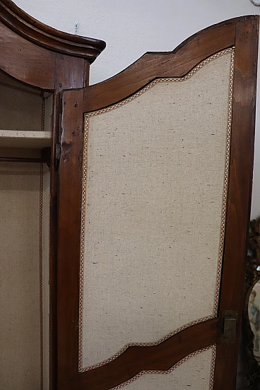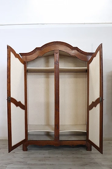 Baroque solid poplar wardrobe, early 18th century. Internally it has two shelves and in the central part a rod for hanging clothes. A simple wardrobe with few decorations but characterized by wavy lines typical of the Piedmontese Baroque period. The inside is fully lined with an elegant light-colored fabric. Please note: this wardrobe cannot be disassembled, check measurements carefully for entry into the home. Excellent wooden condition. Offered at an excellent negotiable price, we invite you to send us your purchase proposals which we will gladly consider. However, we advise you to take a good look in detail at all the attached photos.