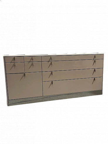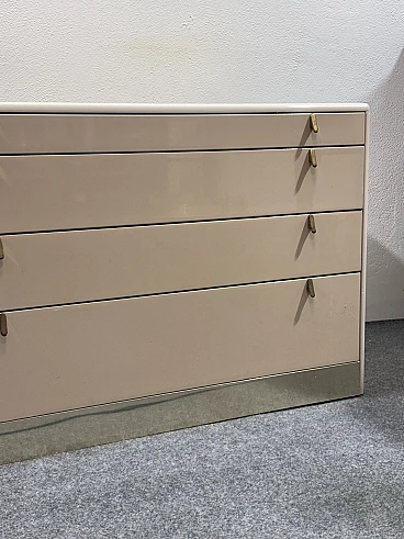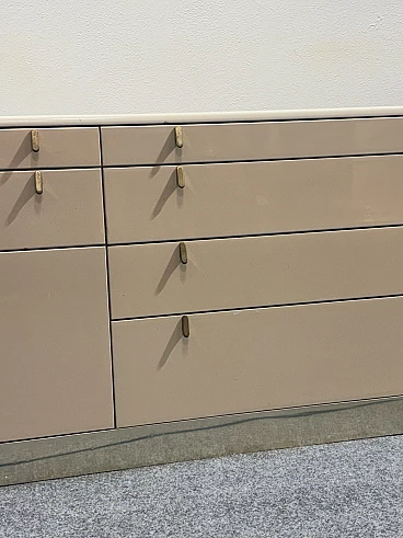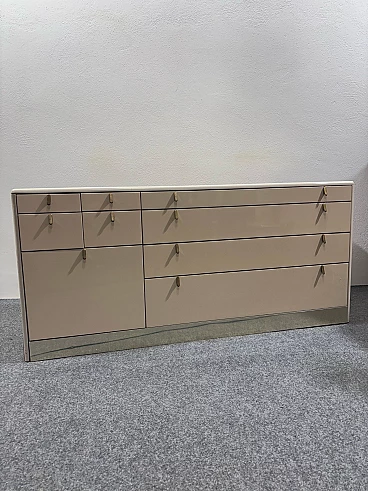 Dresser from the prestigious Henné series by George Coslin for Longato, 1970s. Structure in ivory lacquered wood, handles and base in elegant brass. Note the special drawer, equipped with a dresser and mirror covered with fine leather and brass finishes. The generous dimensions make it an ideal choice for adding style and functionality to the decor. Documented in the prestigious Casa Vogue magazine, n. 44, April 1975, p. 134. Good conservative condition with slight and obvious signs of time due to use and age (see photos).