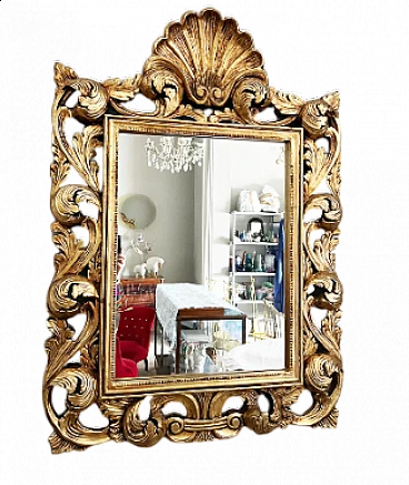 Baroque style mirror, 20th century. Hand-carved wooden frame decorated with authentic gold leaf. Intact and in perfect state of conservation.