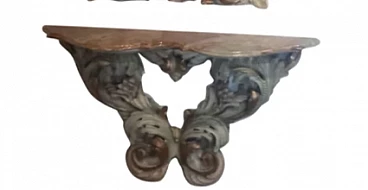 Baroque style console and mirror, 20th century. Console in solid wood carved and decorated by hand with top in precious marble, mirror also carved and decorated by hand. The console is 70 cm high, 125 cm wide and 25 cm deep. The mirror is 120 cm high and 80 cm wide.