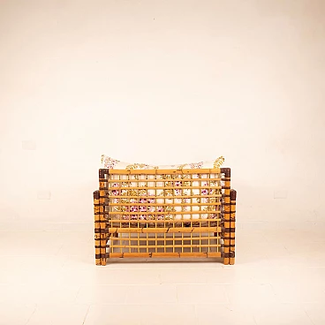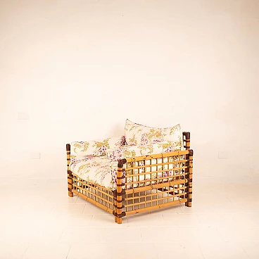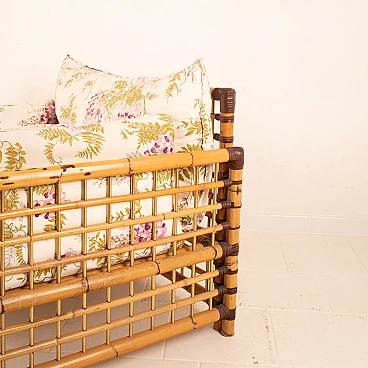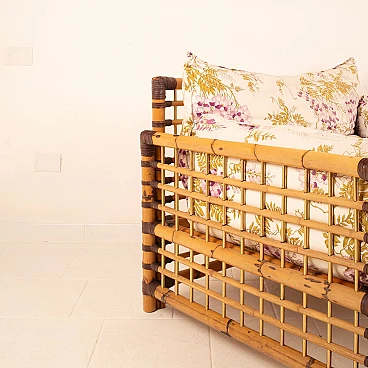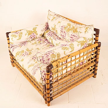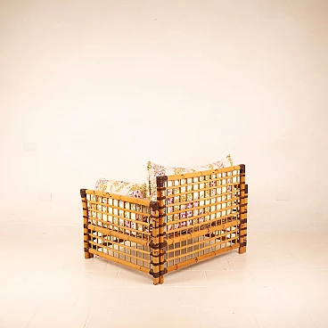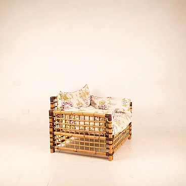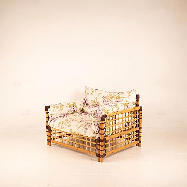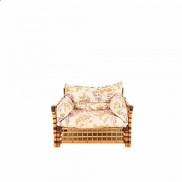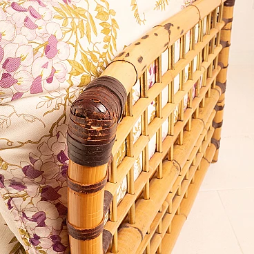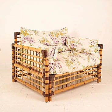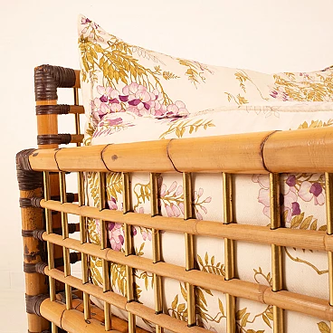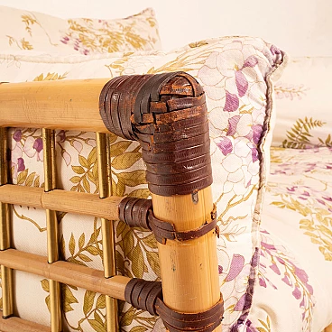 An extraordinary and extremely rare armchair belonging to the 'Marango' series designed by Alberto Smania and produced by the company of the same name in 1967. An incredible piece, testimony to the highest Italian craftsmanship of the time and a timeless luxury, made of cane intersected with vertical brass rods and finished at the joints with leather laces. Original linen cushions and covers with wisteria floral pattern, in perfect condition. Condition is excellent, only tiny signs of time on a few places on the leather as shown in the photographs.