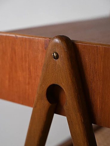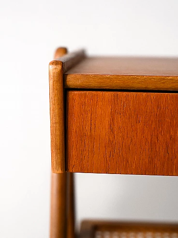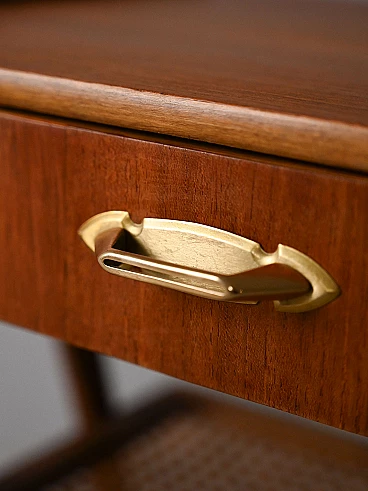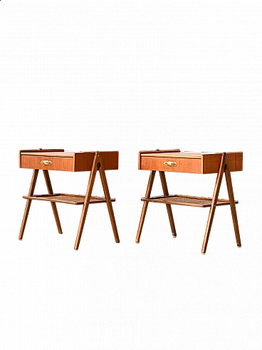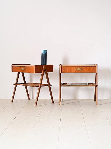 Pair of wooden bedside tables with drawer, golden metal handle and rattan magazine rack. The inverted V-shaped legs give lightness and originality to the structure. These bedside tables stand out for their modern taste and refined details.